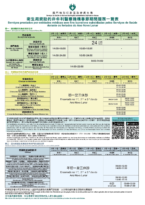 - Consulta externa de 24 horas do Centro Hospitalar Conde de São Januário e o Posto de Urgência das Ilhas: nos dia 12 a 14 de Fevereiro (1.o a 3.o dia do Ano Novo Chinês, das 9h00 às 13h00;
