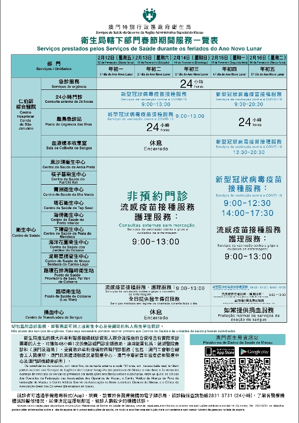 - Nos dias 12 a 14 de Fevereiro (1.o a 3.o dia do Ano Novo Chinês) o Centro de Saúde da Areia Preta, o Centro de Saúde de Fai Chi Kei, o Centro de Saúde da Ilha Verde, o Centro de Saúde do Tap Seac, o Centro de Saúde do Porto Interior, o Centro de Saúde da Praia do Manduco, o Centro de Saúde dos Jardins do Oceano, o Centro de Saúde de Nossa Senhora do Carmo – Lago e o Posto de Saúde Provisório de Seac Pai Van estarão a funcionar entre as 09h00 e as 13h00 para Consultas externas não marcadas;