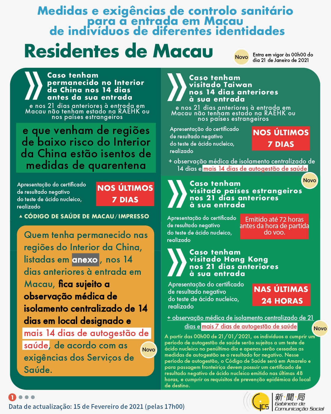 (Infografia) Medidas e exigências de controlo sanitário para a entrada em Macau de indivíduos de diferentes identidades, actualizadas no dia 15 de Fevereiro de 2021