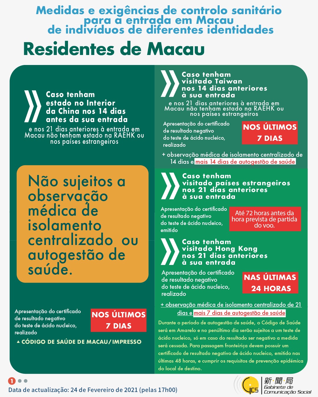 (Infografia) Medidas e exigências de controlo sanitário para a entrada em Macau de indivíduos de diferentes identidades, actualizadas no dia 24 de Fevereiro de 2021