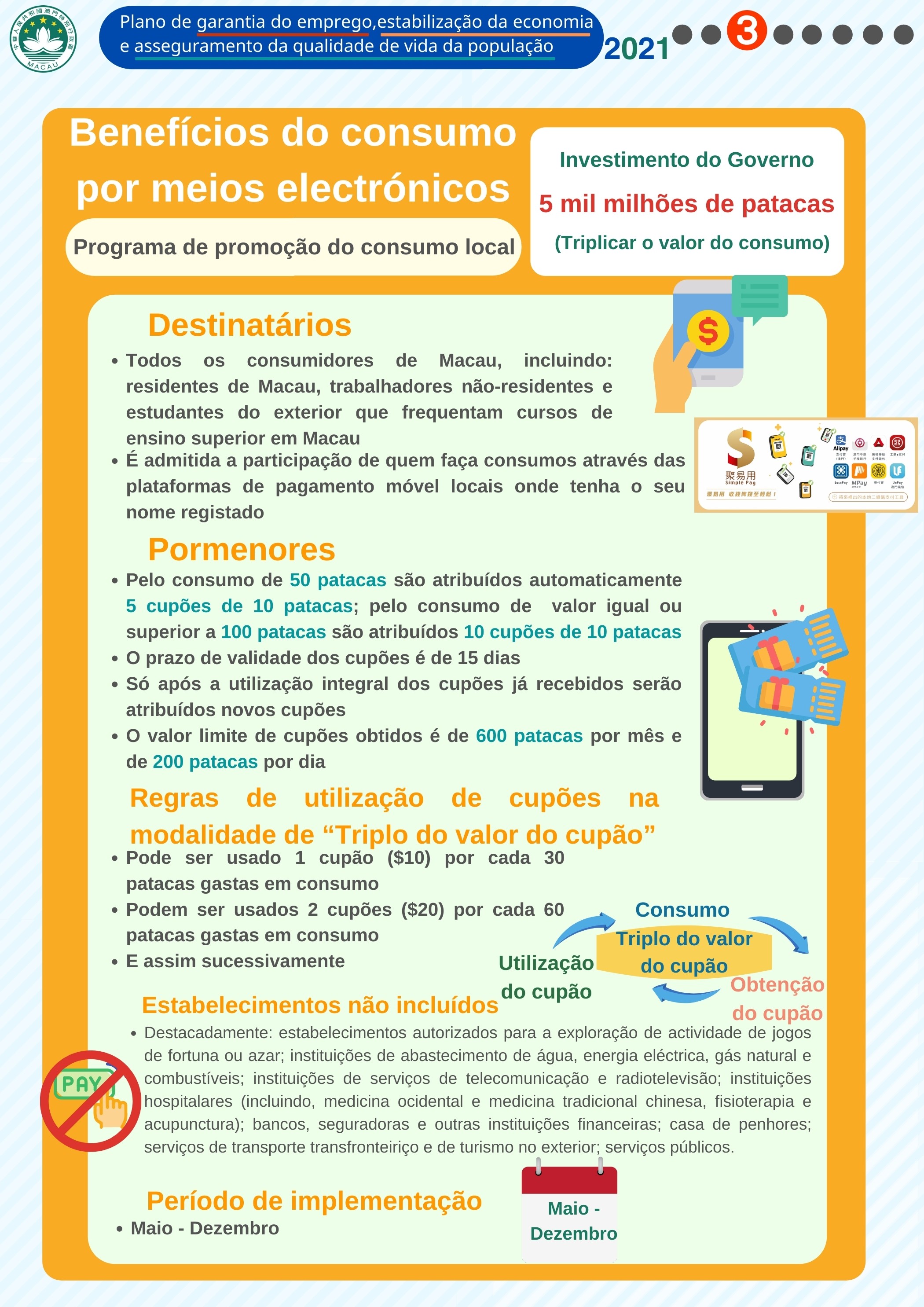 - Face ao uso popularizado dos meios de pagamento electrónicos em Macau, tendo ainda em conta o amadurecimento dos modelos de promoções de consumo adoptados nas actividades de “Carnaval de consumo”, reúnem-se actualmente condições para o lançamento dos Benefícios do consumo por meios electrónicos.