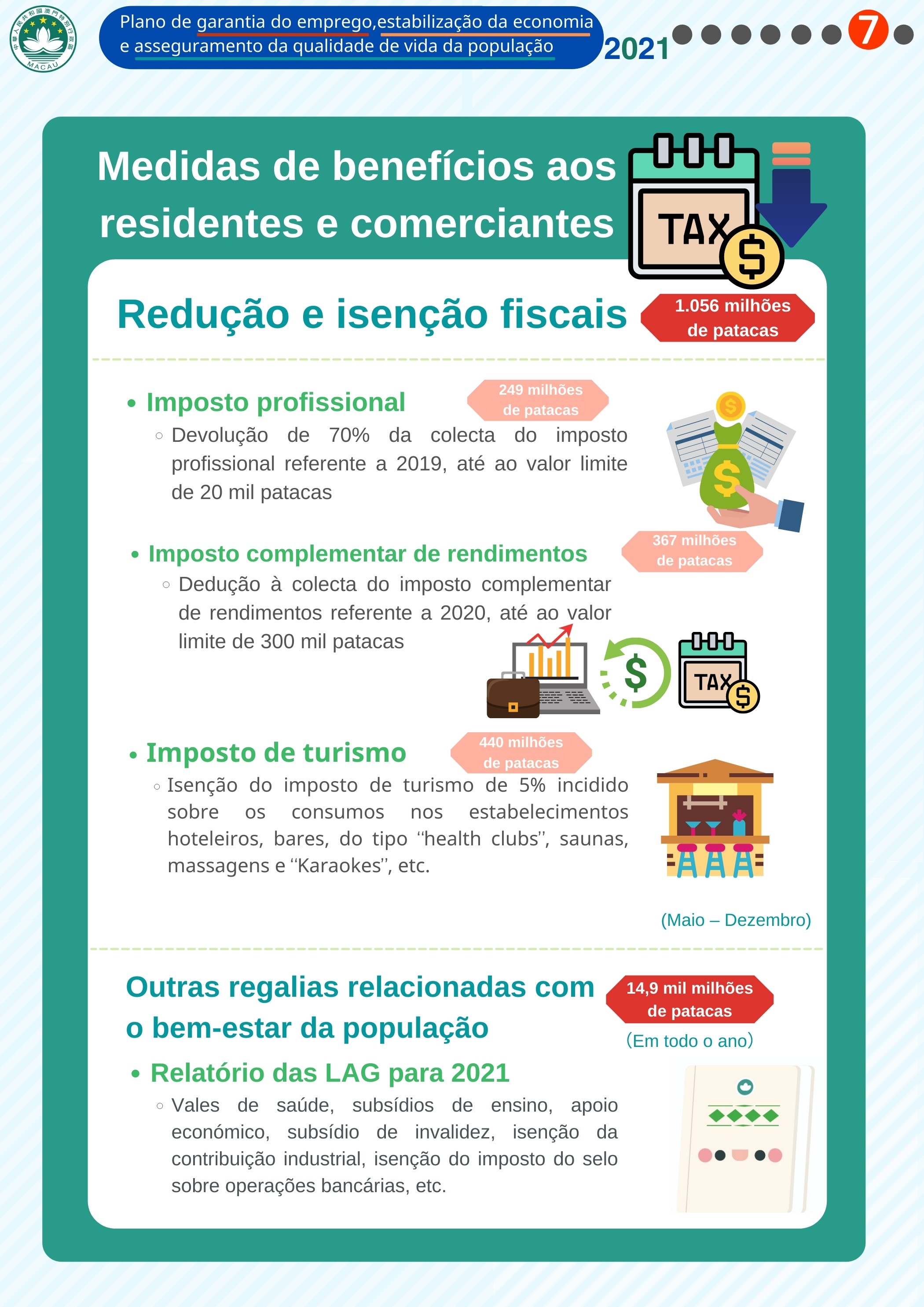 - Redução e isenção fiscais (envolvendo um valor de 1.056 milhões de patacas)