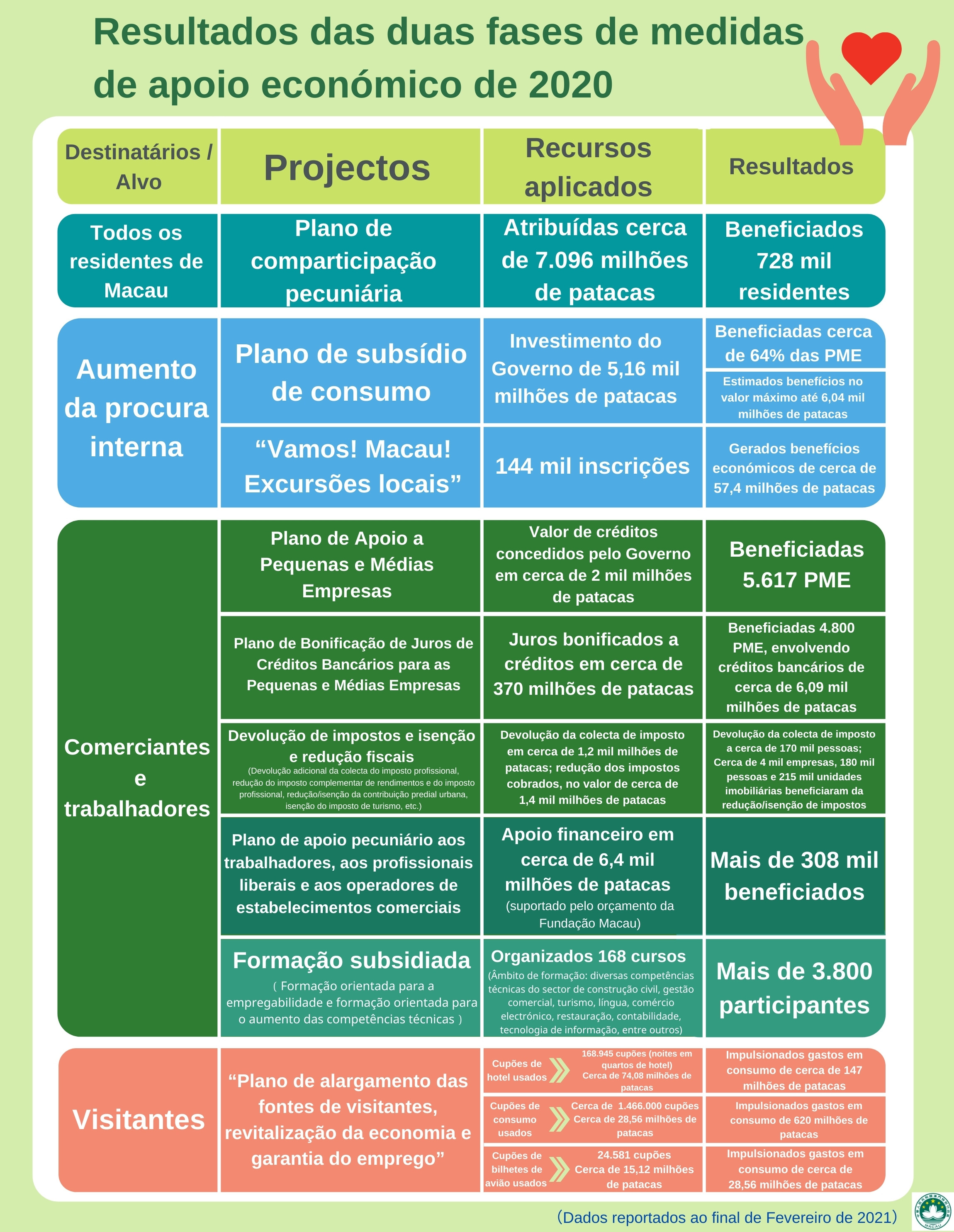 O Governo da RAEM irá implementar o Plano de garantia do emprego, estabilização da economia e asseguramento da qualidade de vida da população 2021, que inclui a atribuição antecipada da comparticipação pecuniária em Abril e o lançamento de uma série de medidas específicas, designadamente benefícios do consumo, apoio aos trabalhadores que se encontram em férias não remuneradas e benefícios aos residentes e comerciantes.
