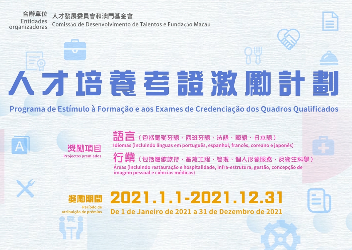 A execução do Programa de Estímulo à Formação e aos Exames de Credenciação dos Quadros Qualificados (adiante designado por Programa), co-organizado pela Comissão de Desenvolvimento de Talentos e Fundação Macau, prossegue, em 2021, com o catálogo de prémios do Programa de 2021 que compreende o Catálogo do Prémio de Línguas Estrangeiras, o Catálogo do Prémio de Exames de Credenciação Sectoriais, o Catálogo do Prémio de Credenciação dos Quadros Qualificados de Finanças Modernas e o Catálogo do Prémio de Credenciação dos Quadros Qualificados de Tecnologia da Informação. O Programa, lançado em 2017, visa aprimorar as competências individuais dos profissionais residentes, fomentar a mobilidade ascendente, bem como a integração no desenvolvimento da sociedade. Tais propósitos surtiram um efeito positivo em termos de encorajamento, dos residentes locais, na participação em exames de credenciação.