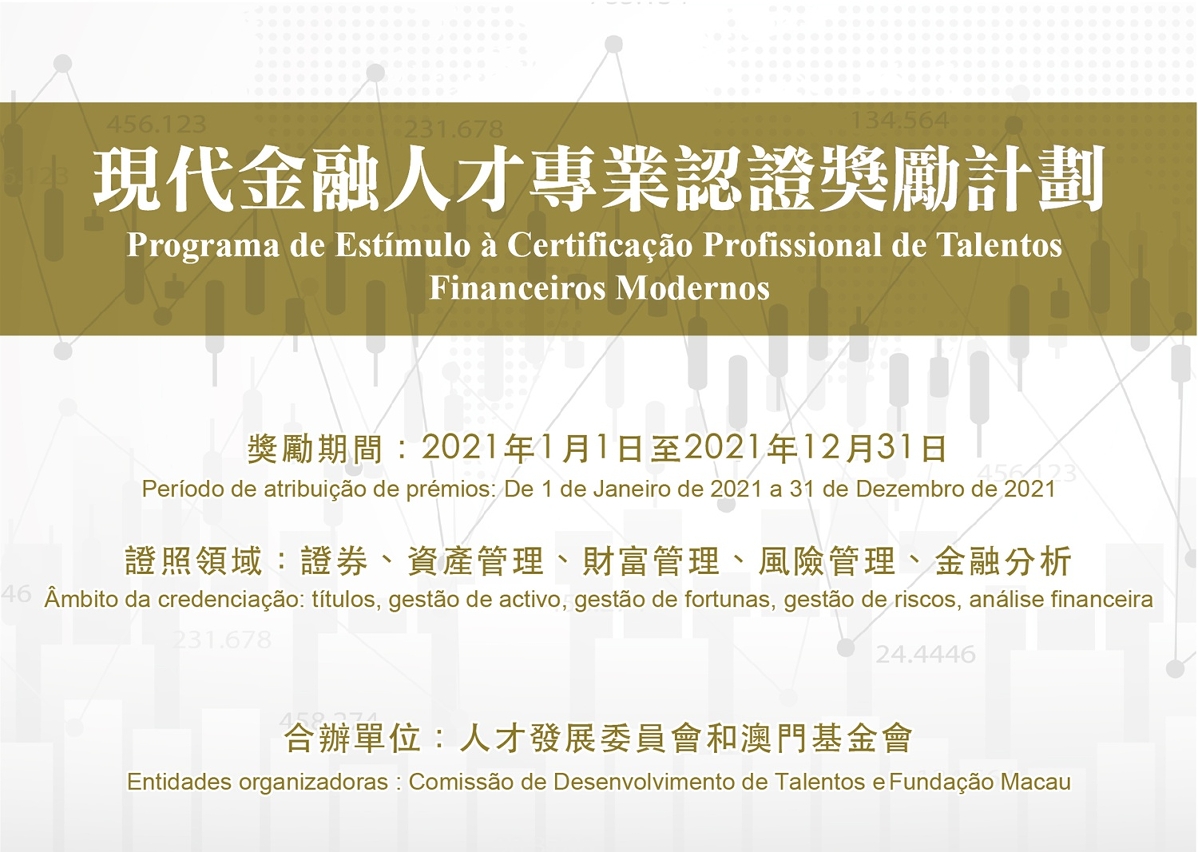 O Programa de Estímulo à Certificação Profissional de Talentos Financeiros Modernos visa incentivar os residentes de Macau a obterem certificação profissional nas áreas de valores mobiliários, gestão de activos, gestão de fortunas, gestão de riscos e análise financeira. Os prémios serão instituídos, gradualmente, do nível inferior ao superior. No primeiro ano, o programa começará pela realização dos exames de credenciação de nível básico, estendendo-se, anualmente, aos exames de nível superior. Assim se criará uma reserva de quadros qualificados, do sector financeiro, detentores de certificação profissional.