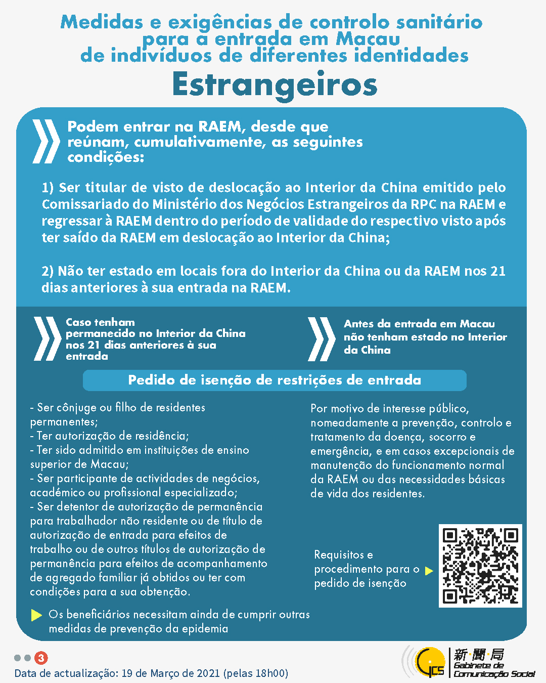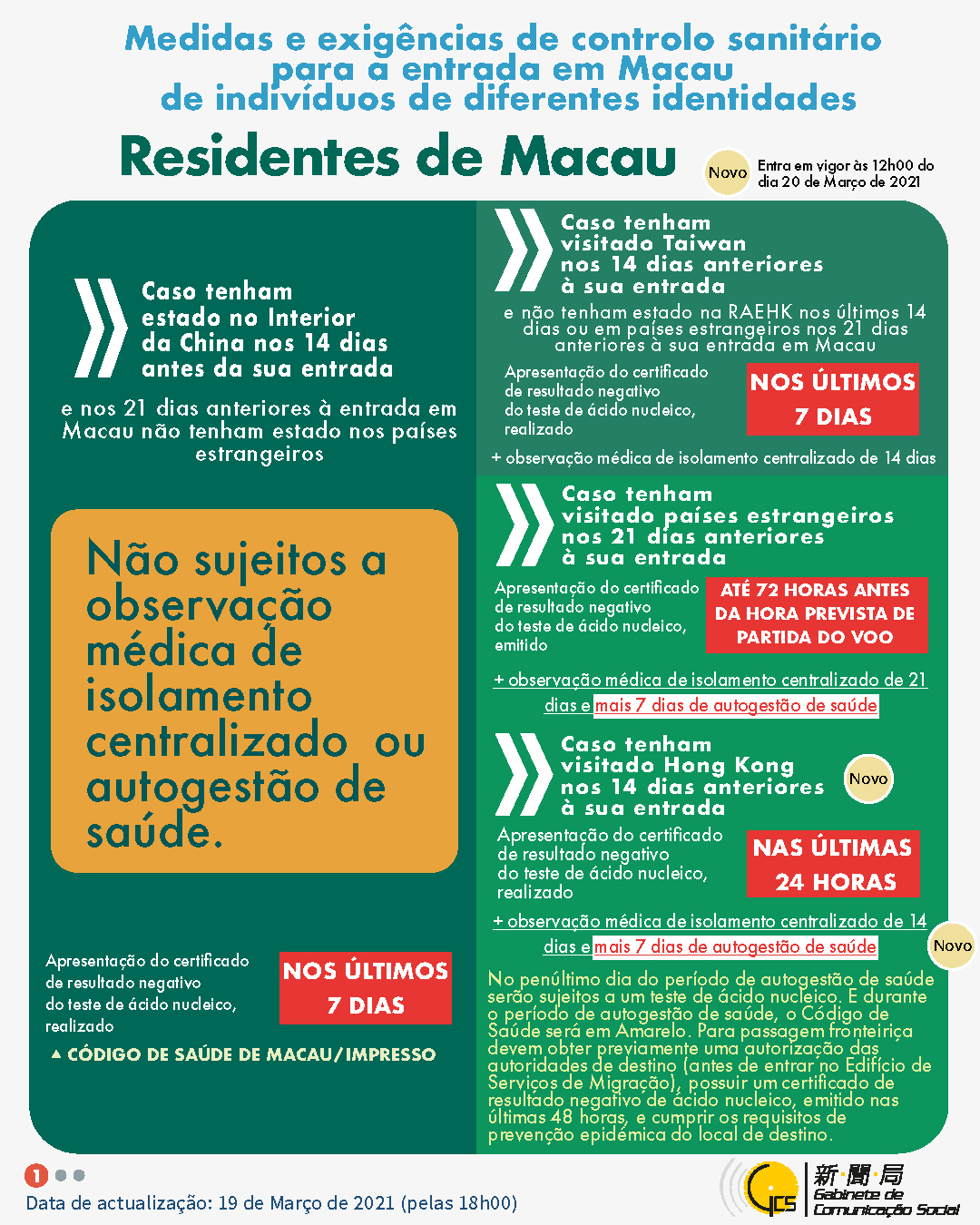 (Infografia)Medidas e exigências de controlo sanitário para a entrada em Macau de indivíduos de diferentes identidades, actualizadas no dia 19 de Março de 2021