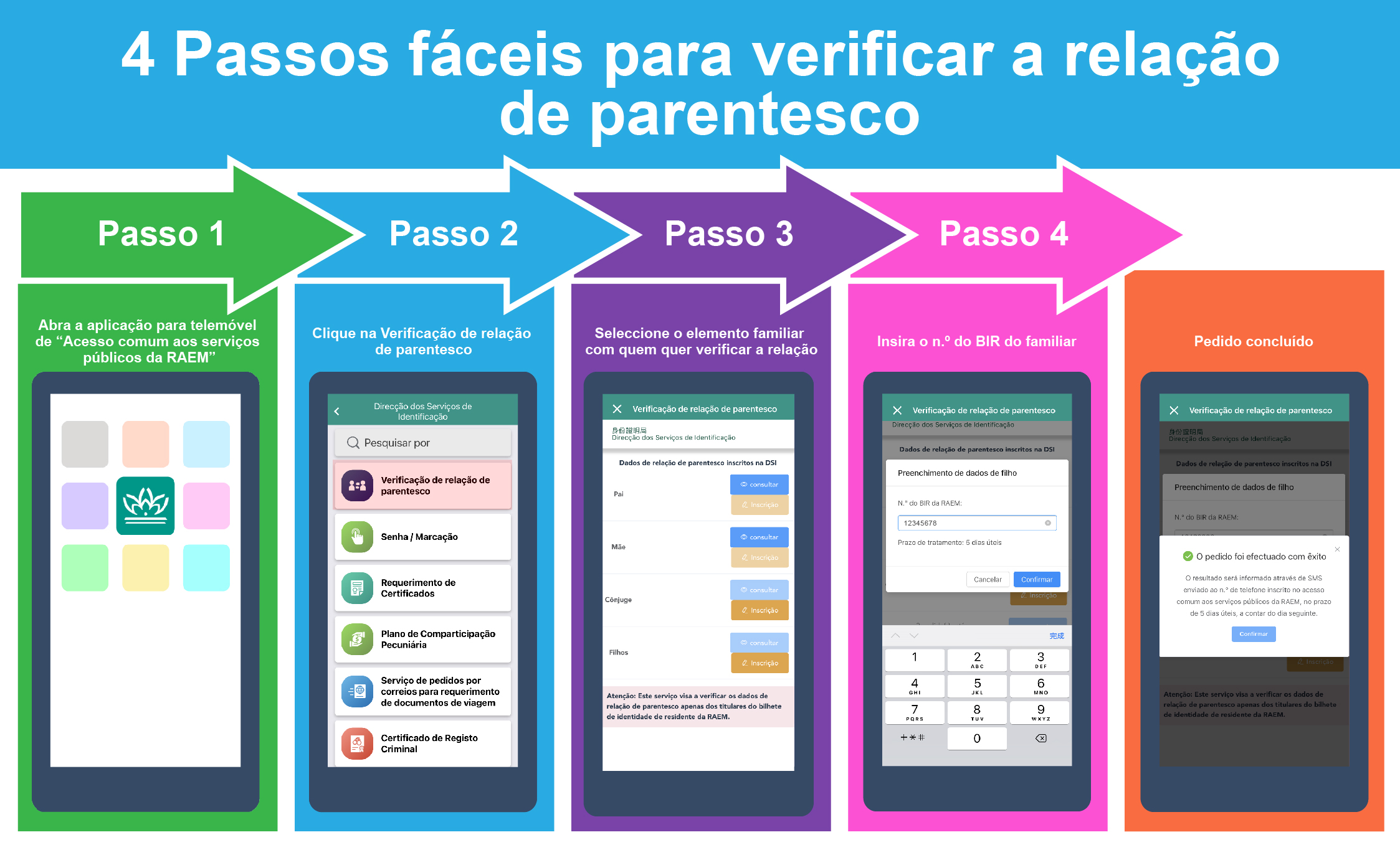 Quanto às informações sobre a verificação da relação de parentesco estão disponíveis na página electrónica da DSI http://www.dsi.gov.mo/QAndA_p.jsp#CH7.