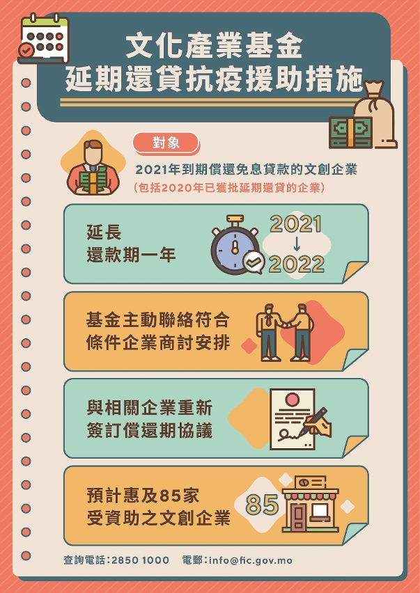 Para aliviar o impacto na economia derivado da pneumonia causada pelo novo tipo de coronavírus, o Fundo das Indústrias Culturais (FIC) implementa a segunda ronda de medida de apoio na propagação epidémica, com prorrogação de reembolso, para reduzir a pressão económica das empresas culturais e criativas, devido à desaceleração económica durante a disseminação epidémica.