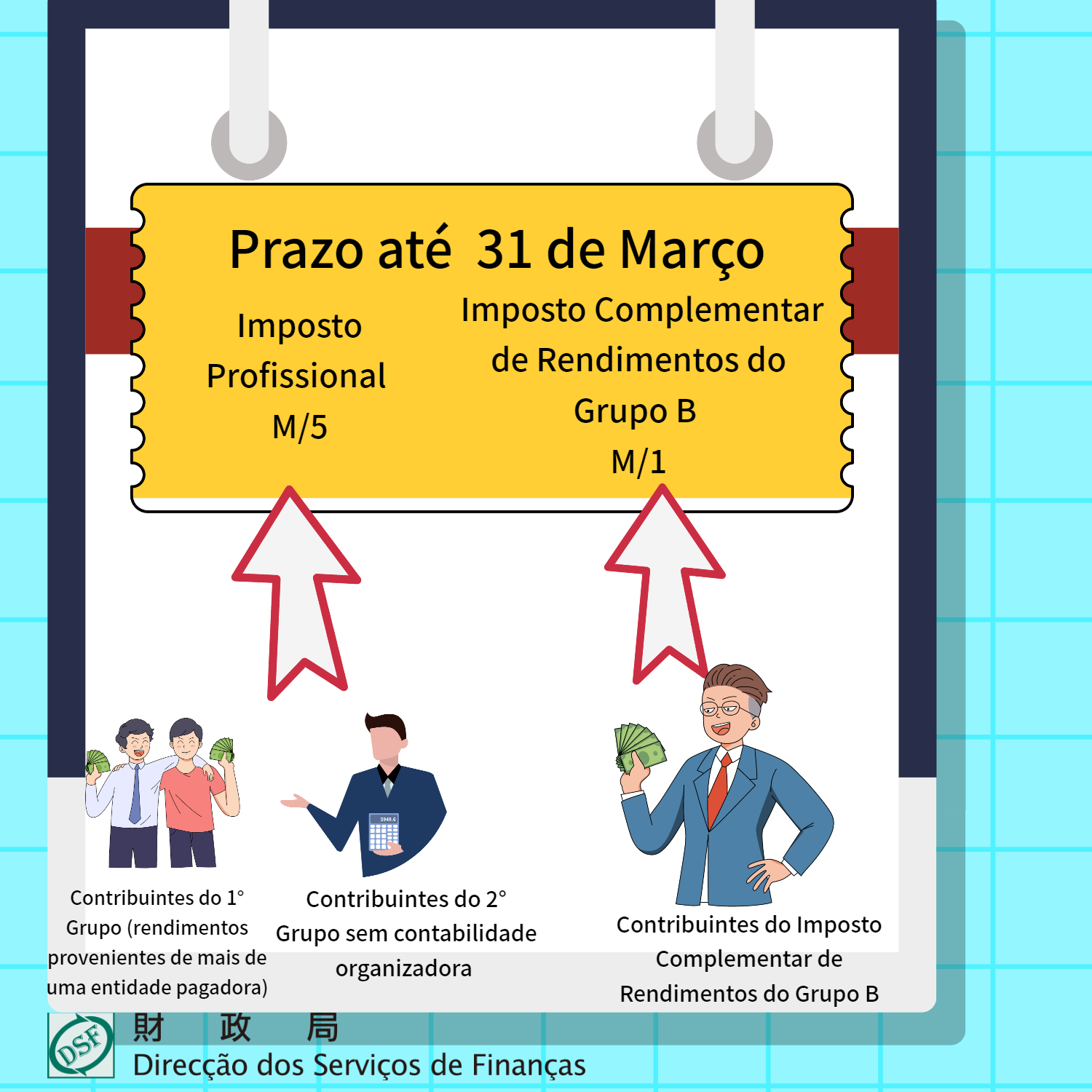 A Direcção dos Serviços de Finanças apela aos contribuintes do Imposto Complementar de Rendimentos do Grupo B que devem, através da declaração de rendimentos do modelo M/1, declarar os rendimentos obtidos das actividades industrial ou comercial do ano transacto, e o prazo para a apresentação das declarações de rendimentos do exercício de 2020 é em 31 de Março de 2021. Além disso, os contribuintes do Imposto Profissional do 1.º Grupo cujos rendimentos provenham de mais de uma entidade empregadora, bem como para os do 2.º Grupo, sem contabilidade organizada, conforme o despacho n.º 25/2021 do Sr. Secretário para a Economia e Finanças, o prazo para a entrega das declarações de rendimentos do Imposto Profissional do modelo M/5 referente ao exercício de 2020, será prorrogado até 31 de Março de 2021.