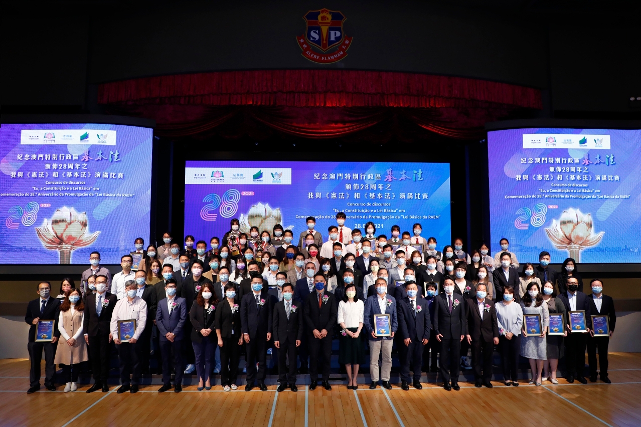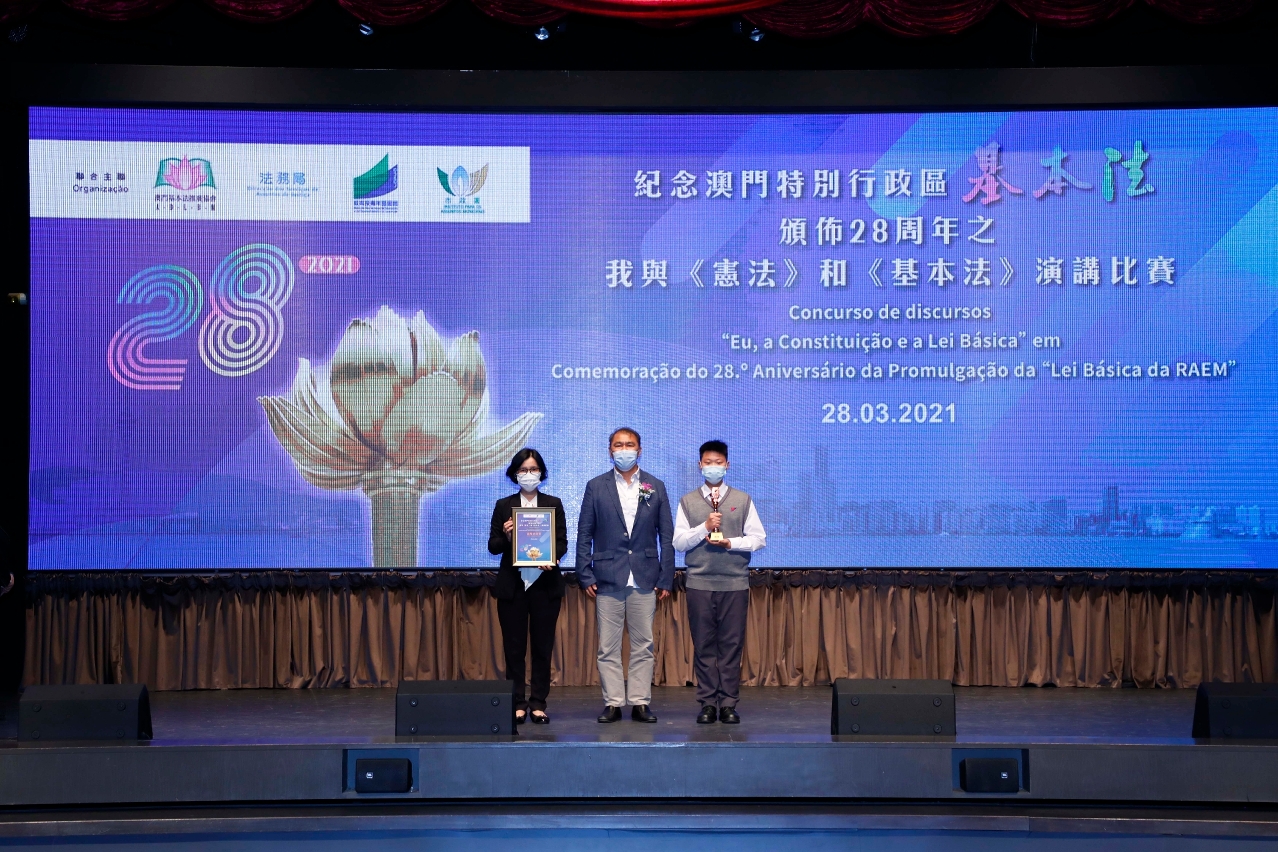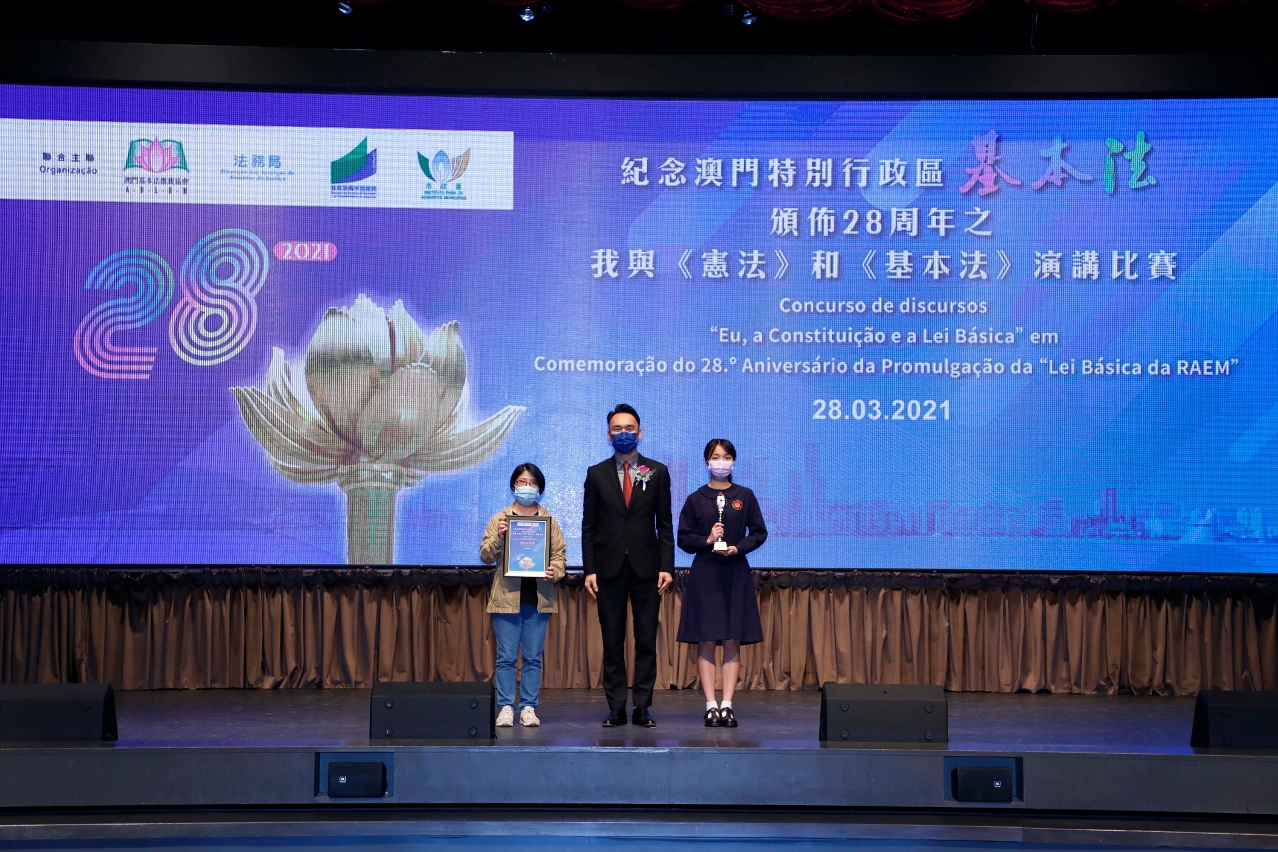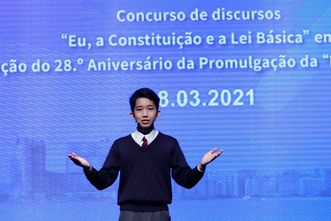 A fim de continuar a promover a Constituição e a Lei Básica junto dos jovens, foi realizada com sucesso, no dia 28 de Março, a fase final do Concurso de discursos “Eu, a Constituição e a Lei Básica”, realizado no âmbito da Comemoração do 28.º Aniversário da Promulgação da “Lei Básica da RAEM”, no auditório da Escola São Paulo. O Concurso foi organizado, conjuntamente, pela Associação de Divulgação da Lei Básica de Macau, pela Direcção dos Serviços de Assuntos de Justiça, pela Direcção dos Serviços de Educação e de Desenvolvimento da Juventude e pelo Instituto para os Assuntos Municipais.