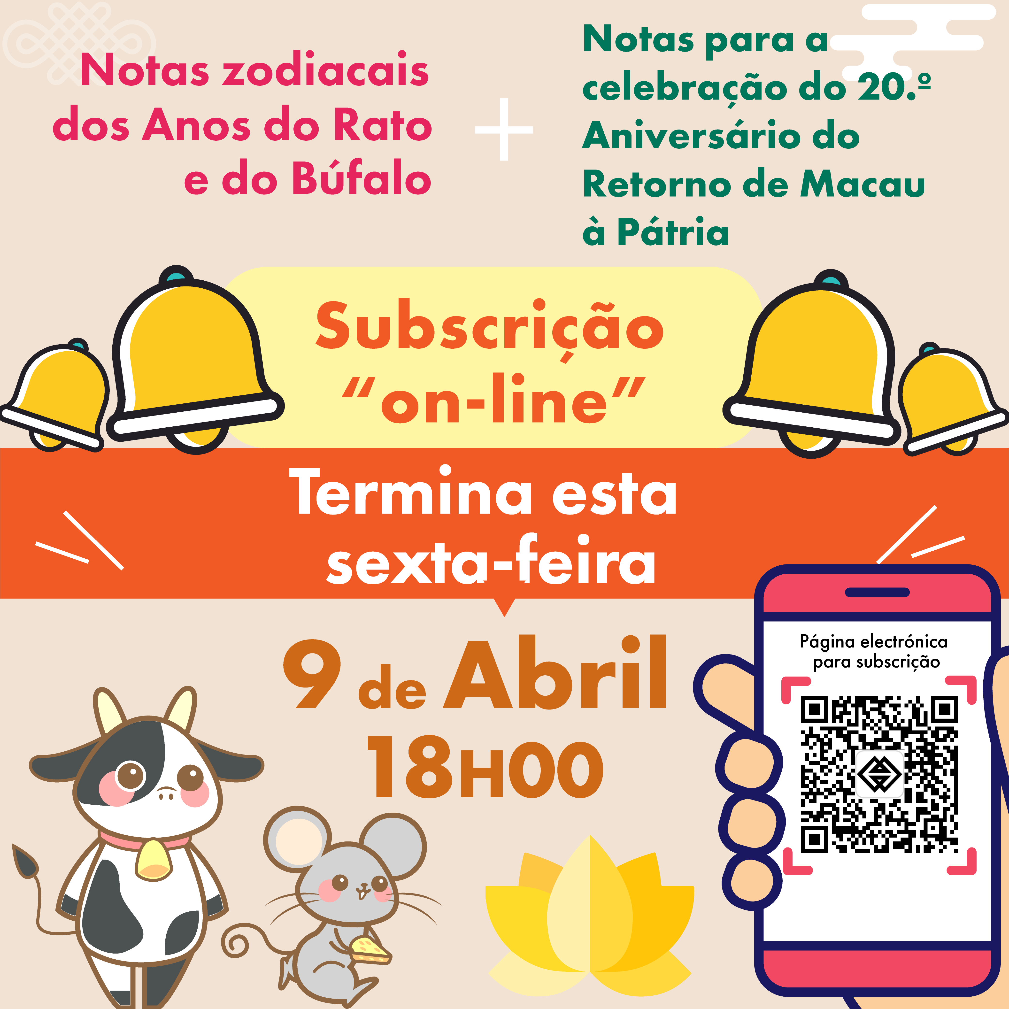O prazo para a subscrição prévia das notas zodiacais dos Anos do Rato e do Búfalo e das notas para a celebração do 20.º Aniversário do Retorno de Macau à Pátria, emitidas anteriormente, termina às 18 horas do dia 9 de Abril de 2021 (sexta-feira). Assim sendo, a AMCM alerta os residentes de Macau interessados na troca das referidas notas para o facto de estes deverem proceder, à referida subscrição “on-line”, até ao termo do prazo estabelecido.