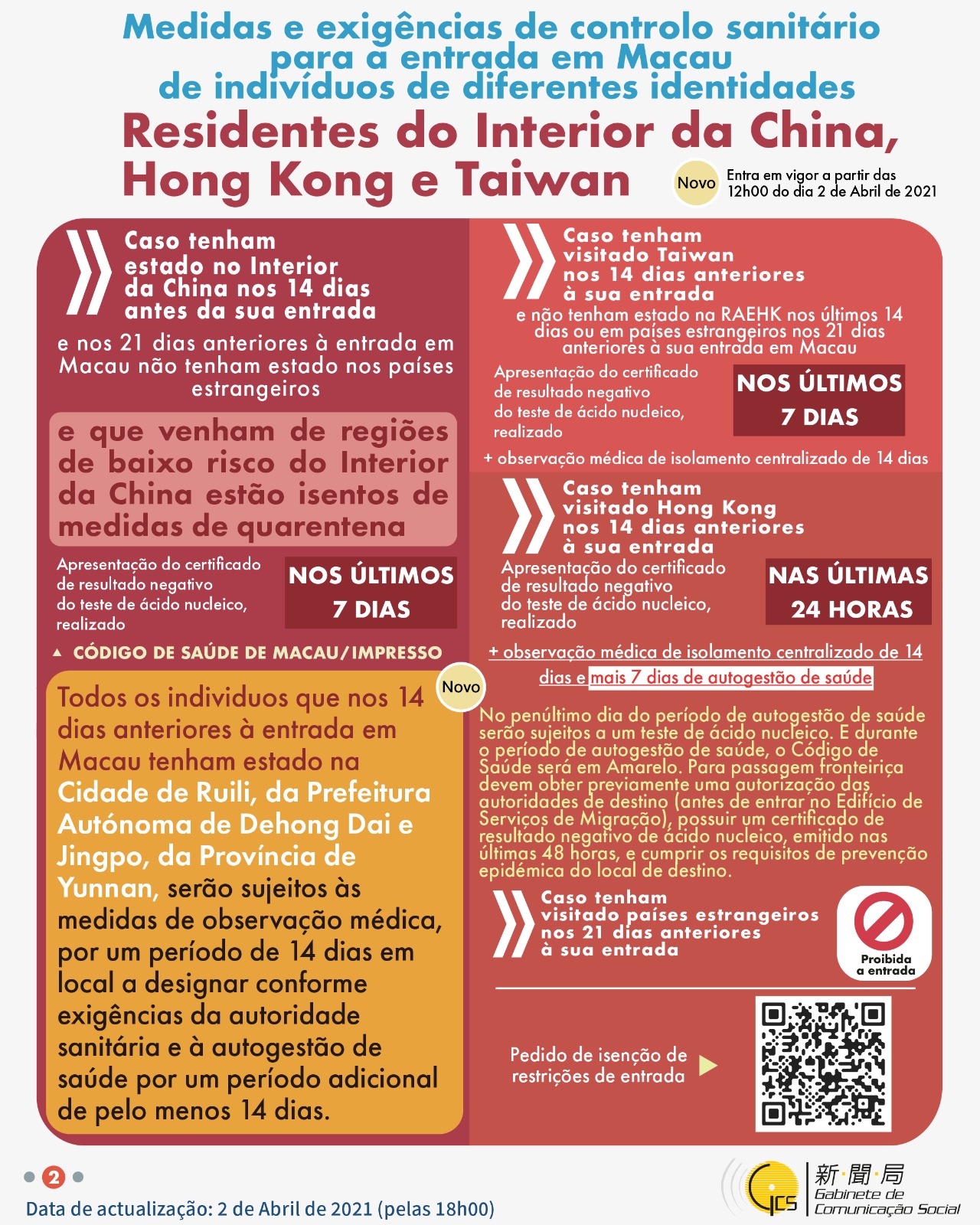 (Infografia)Medidas e exigências de controlo sanitário para a entrada em Macau de indivíduos de diferentes identidades, actualizadas no dia 2 de Abril de 2021