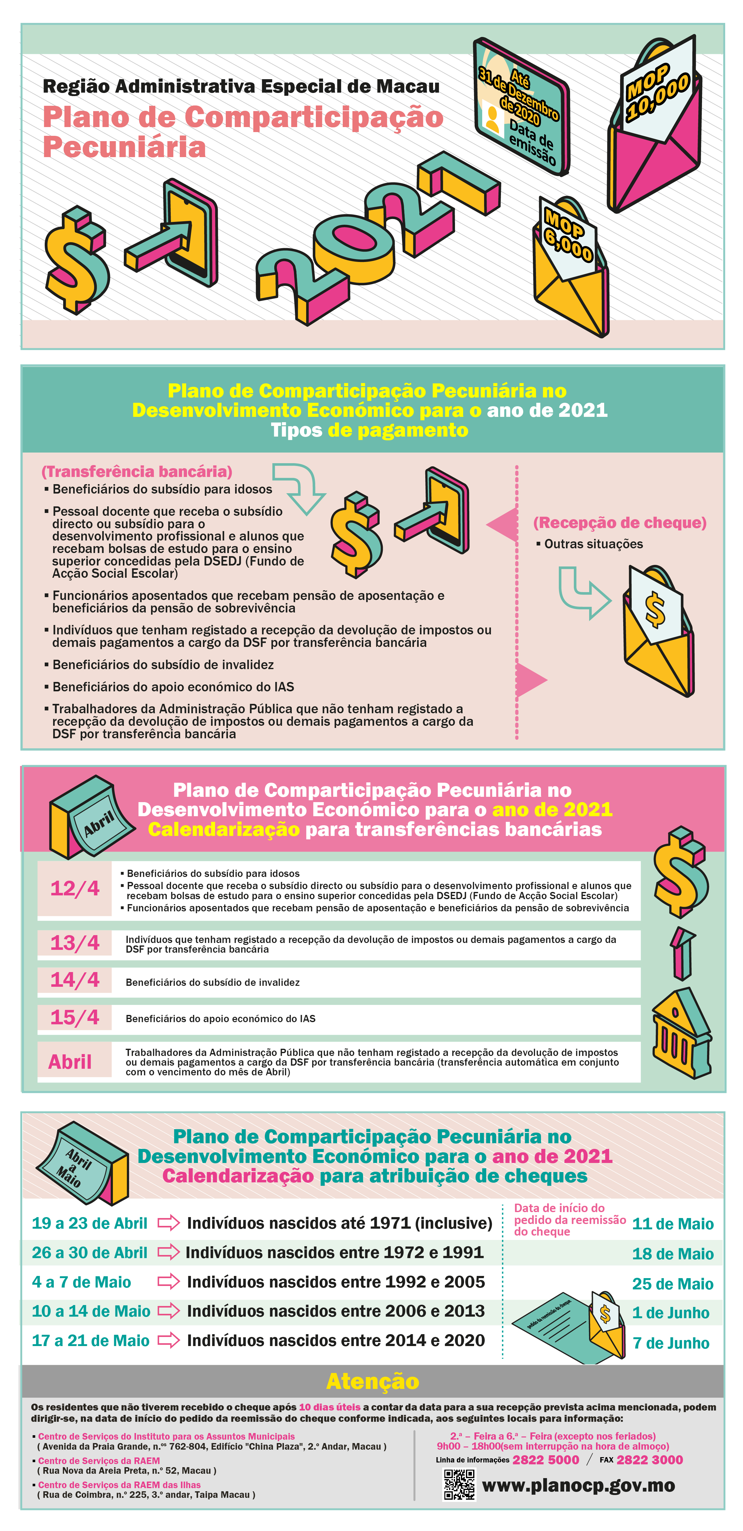 A fim de se coadunar com a execução do Plano de Comparticipação Pecuniária, os cidadãos que tenham dúvidas sobre o Plano do ano em curso ou dos anos anteriores, ou que necessitem de apoio na resolução de problemas em causa, podem dirigir-se, pessoalmente, aos balcões do Plano de Comparticipação Pecuniária do Centro de Serviços do Instituto para os Assuntos Municipais, sito na Avenida da Praia Grande, n.º 762-804, Edifício "China Plaza", 2.º andar; do Centro de Serviços da RAEM, sito na Rua Nova da Areia Preta, n.º 52; ou do Centro de Serviços da RAEM das Ilhas, sito na Rua de Coimbra, n.º 225, 3.º andar, Taipa, podendo, também, para efeitos de consulta, telefonar para a linha aberta através do número 2822-5000, ou enviar pelo fax número 2822-3000. O horário de funcionamento dos referidos balcões é das 9H00 às 18H00, de segunda-feira a sexta-feira (excepto feriados), sem interrupções à hora de almoço. Em simultâneo, os cidadãos podem, ainda, navegar pela página electrónica do Plano de Comparticipação Pecuniária, ou seguir o WeChat ID da DSF, para fins de consulta de informações mais actualizadas sobre a atribuição.