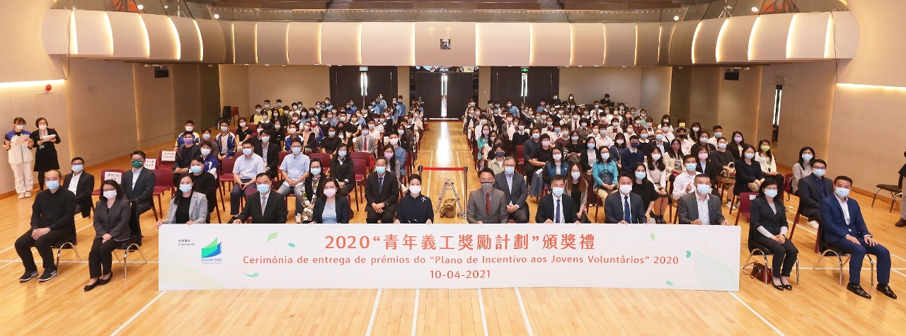 A Cerimónia de Entrega de Prémios do “Plano de Incentivo aos Jovens Voluntários” 2020, organizada pela Direcção dos Serviços de Educação e de Desenvolvimento da Juventude (DSEDJ), teve lugar na tarde do dia 10 de Abril de 2021 (sábado), no auditório da Escola São Paulo de Macau. O evento teve como objectivo elogiar e reconhecer a contribuição e o comprometimento dos jovens voluntários, em prol da sociedade, promovendo a adesão por parte dos vários sectores da sociedade e dos jovens, estimulando a participação positiva dos jovens nos trabalhos voluntários e desenvolvendo o espírito de entreajuda, trazendo, em conjunto, mais energia positiva à sociedade de Macau. A cerimónia contou com a presença dos seguintes convidados: o Subdirector da DSEDJ, Kong Chi Meng, a adjunta do Comandante-geral dos Serviços de Polícia Unitários, Lao Wan Seong, os vogais do Conselho de Juventude, os representantes dos serviços e entidades públicas aderentes, os representantes das associações sociais e das escolas, bem como os jovens voluntários, num total de mais de 180 participantes.