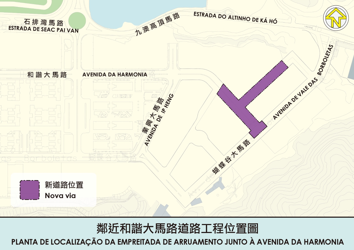A empreitada de arruamentos junto à Avenida da Harmonia abrange uma área aproximada de 5 600m2, consiste na abertura de uma via pública, com um comprimento de cerca de 280 metros, que fará a interligação entre a Avenida da Harmonia e as vias da Avenidas de Vale das Borboletas que ainda estão em curso. Para além disso, a obra inclui também a instalação da rede de drenagem de águas pluviais e residuais, dos poços de captação de águas pluviais, dos sinais de trânsito, a pavimentação de passeios e das vias rodoviárias, etc..