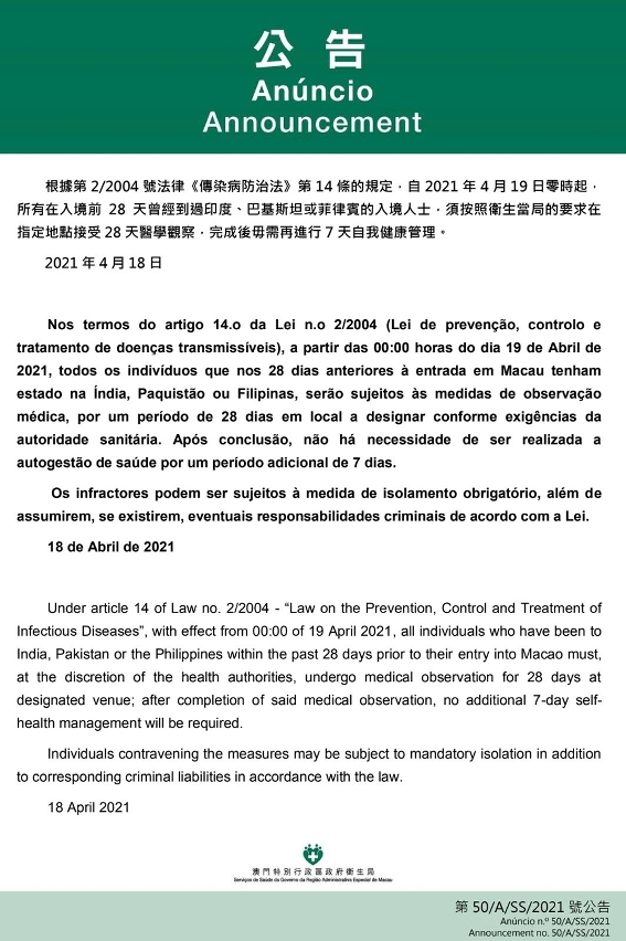 O Centro de Coordenação de Contingência do Novo Tipo de Coronavírus informa que tendo em consideração a evolução epidemiológica mais actualizada, nos termos do artigo 14.º da Lei n.º 2/2004 (Lei de prevenção, controlo e tratamento de doenças transmissíveis), a partir das 00:00 horas do dia 19 de Abril de 2021, todos os indivíduos que nos 28 dias anteriores à entrada em Macau tenham estado na Índia, Paquistão e Filipinas, serão sujeitos às medidas de observação médica, por um período de 28 dias em local a designar conforme exigências da autoridade sanitária.