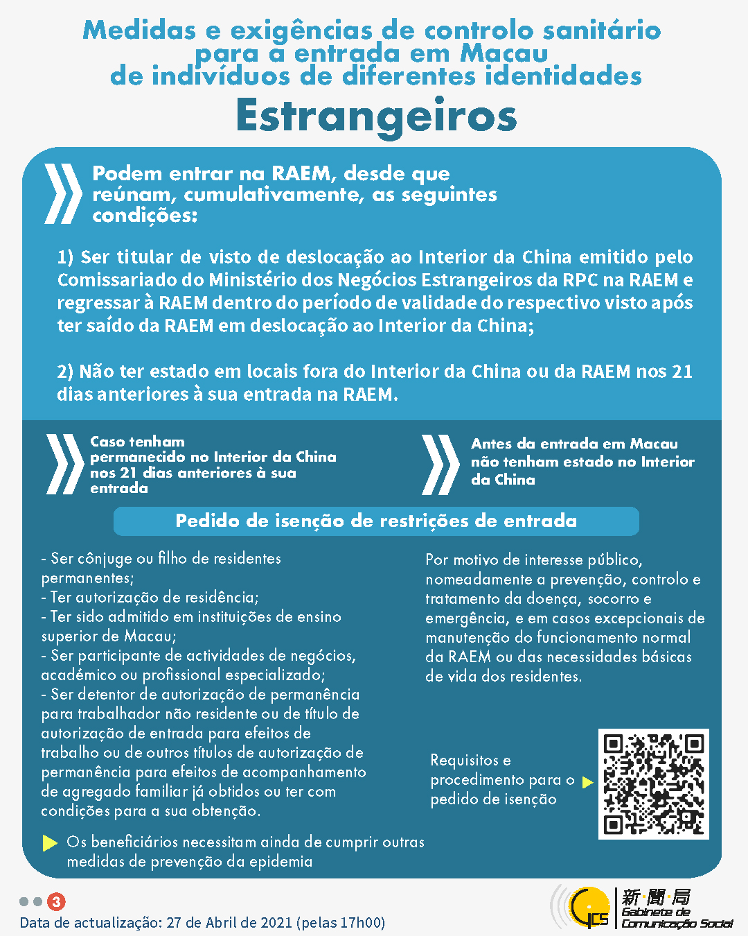 (Infografia)Medidas e exigências de controlo sanitário para a entrada em Macau de indivíduos de diferentes identidades, actualizadas no dia 27 de Abril de 2021