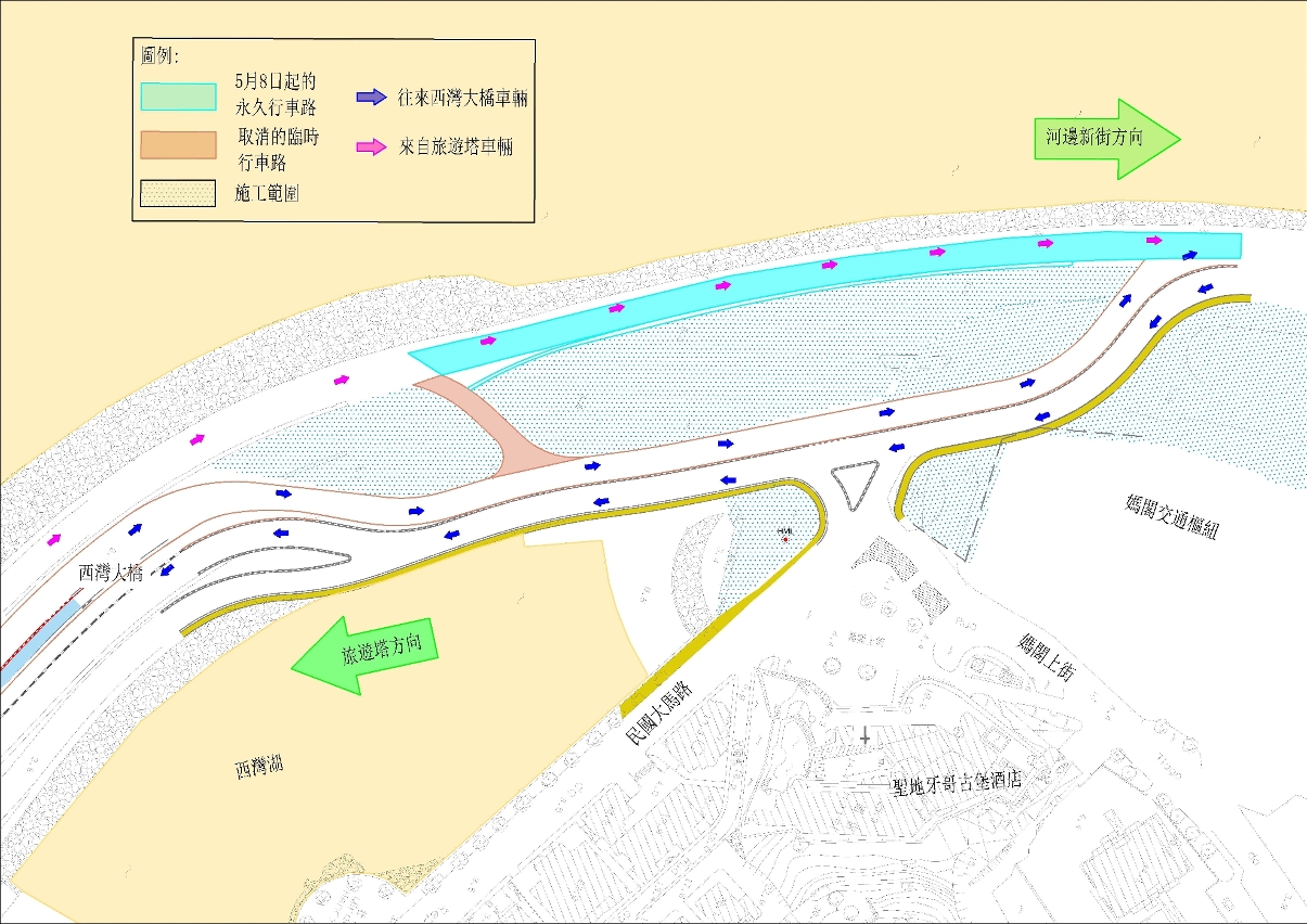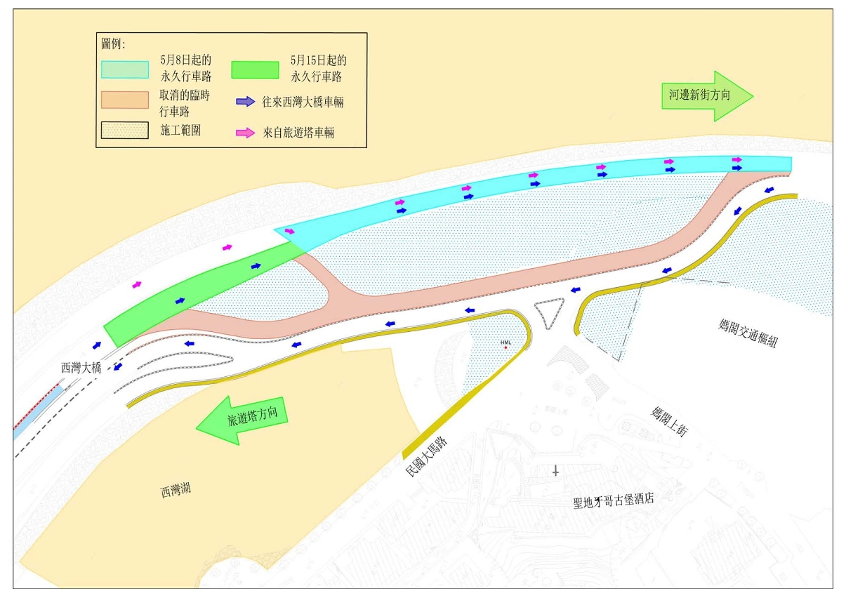 - Mantém-se inalterada a actual circulação para os veículos em direcção à Torre de Macau e à Ponte de Sai Van para Taipa ao longo da Avenida Panorâmica do Lago Sai Van.