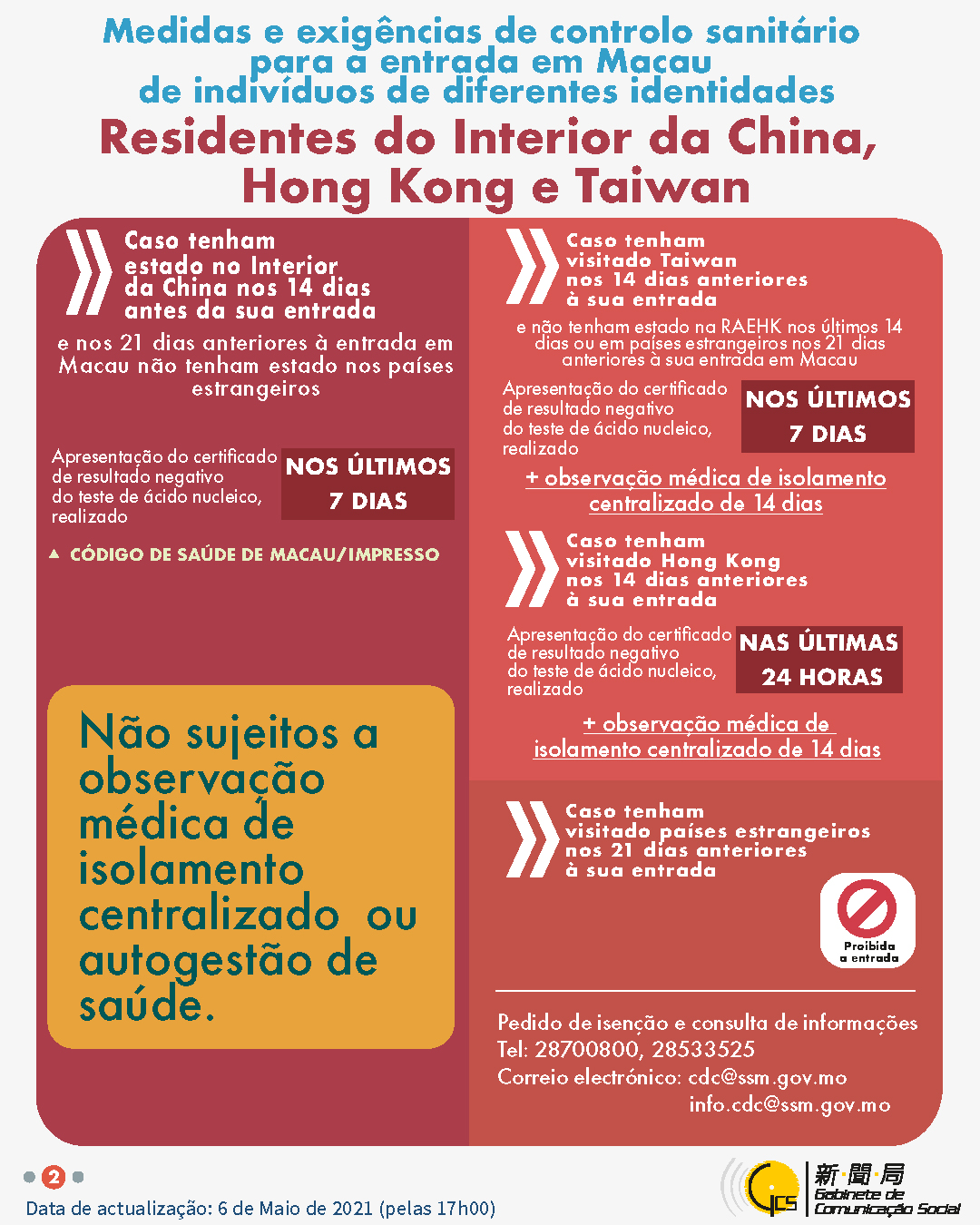 (Infografia)Medidas e exigências de controlo sanitário para a entrada em Macau de indivíduos de diferentes identidades, actualizadas no dia 6 de Maio de 2021