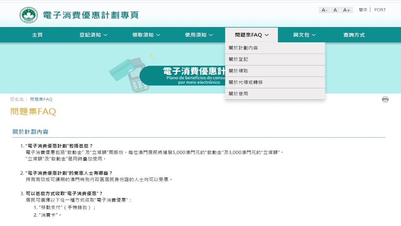 As informações da página exclusiva do “Plano de benefícios de consumo por meio electrónico” são ricas, onde se encontra um conjunto de animação promocional, vídeos de demonstração, infografia e compilação de perguntas e respostas, em que estão classificados de acordo com as diferentes fases, nomeadamente a inscrição, levantamento e utilização, dando facilidades aos residentes conhecerem os diferentes conteúdos do Plano programa, de acordo com as suas necessidades: