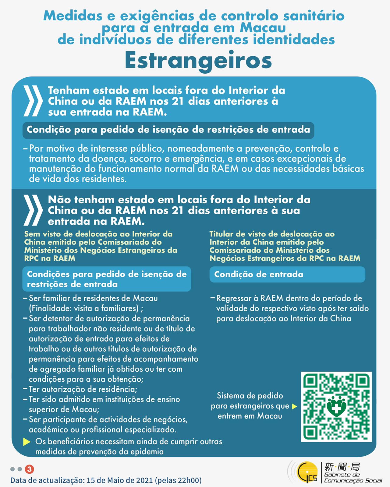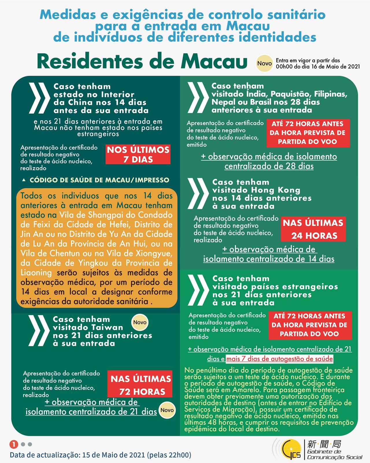 (Infografia)Medidas e exigências de controlo sanitário para a entrada em Macau de indivíduos de diferentes identidades, actualizadas no dia 16 de Maio de 2021