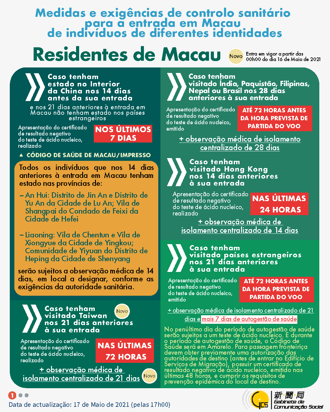 (Infografia)Medidas e exigências de controlo sanitário para a entrada em Macau de indivíduos de diferentes identidades, actualizadas no dia 17 de Maio de 2021