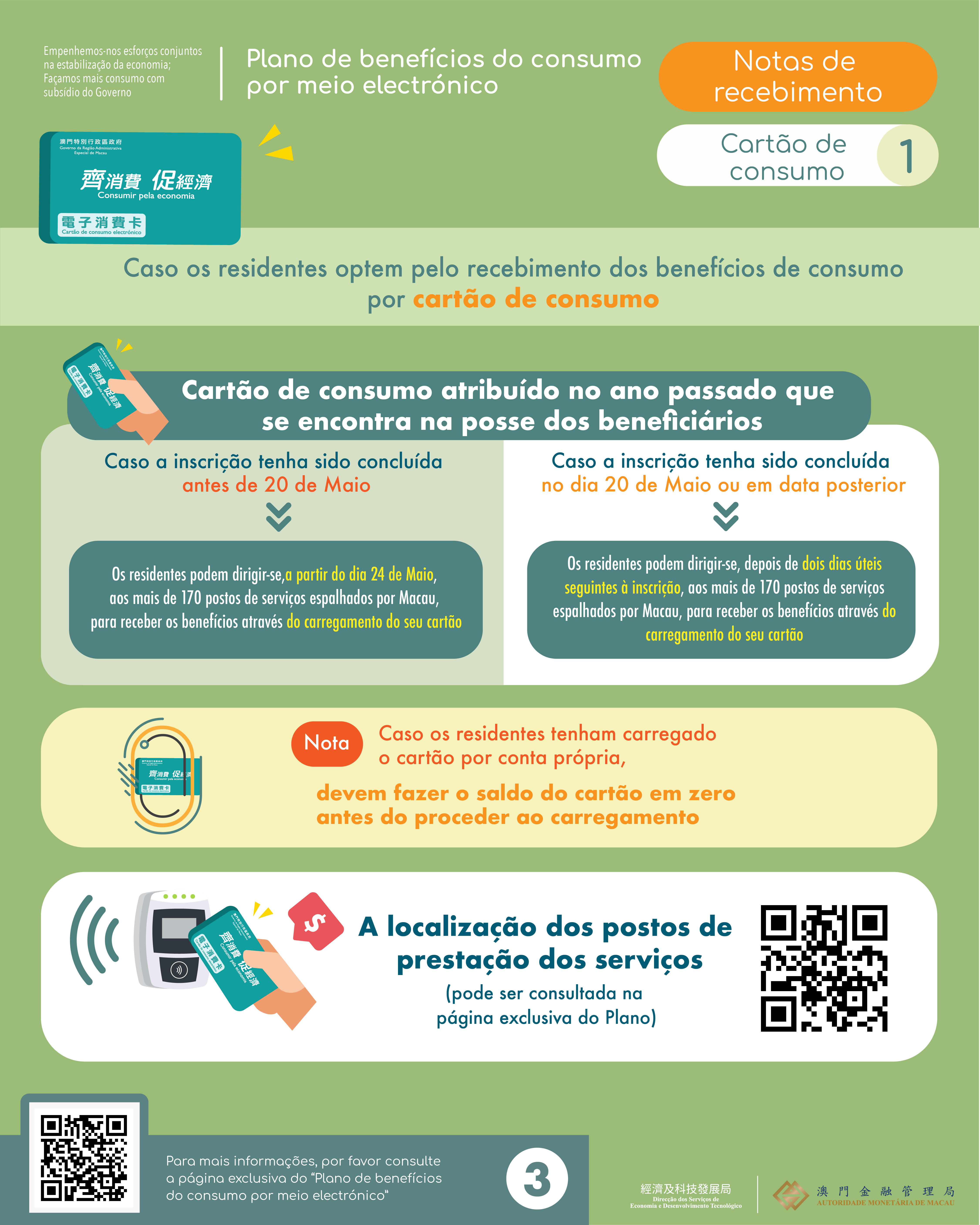 Os residentes que optem por receber os benefícios por “cartão de consumo”, desde que tenham concluído a inscrição antes de amanhã (dia 20), poderão receber os benefícios através do carregamento do seu cartão de consumo a partir das 9h00 de 24 de Maio, sendo o processo muito simples e célere. Aqueles que tenham a sua inscrição concluída depois de 20 de Maio, inclusive, poderão receber os benefícios através do carregamento dois dias úteis após a conclusão da inscrição. Há mais de 170 postos de serviços de carregamento espalhados por Macau, cuja localização pode ser consultada na página exclusiva do Plano (https://www.dsedt.gov.mo/econsumo/pt_PT/topup_loc.jsp). Caso tenham carregado o cartão por conta própria, devem fazer o saldo do cartão em zero antes do proceder ao carregamento.