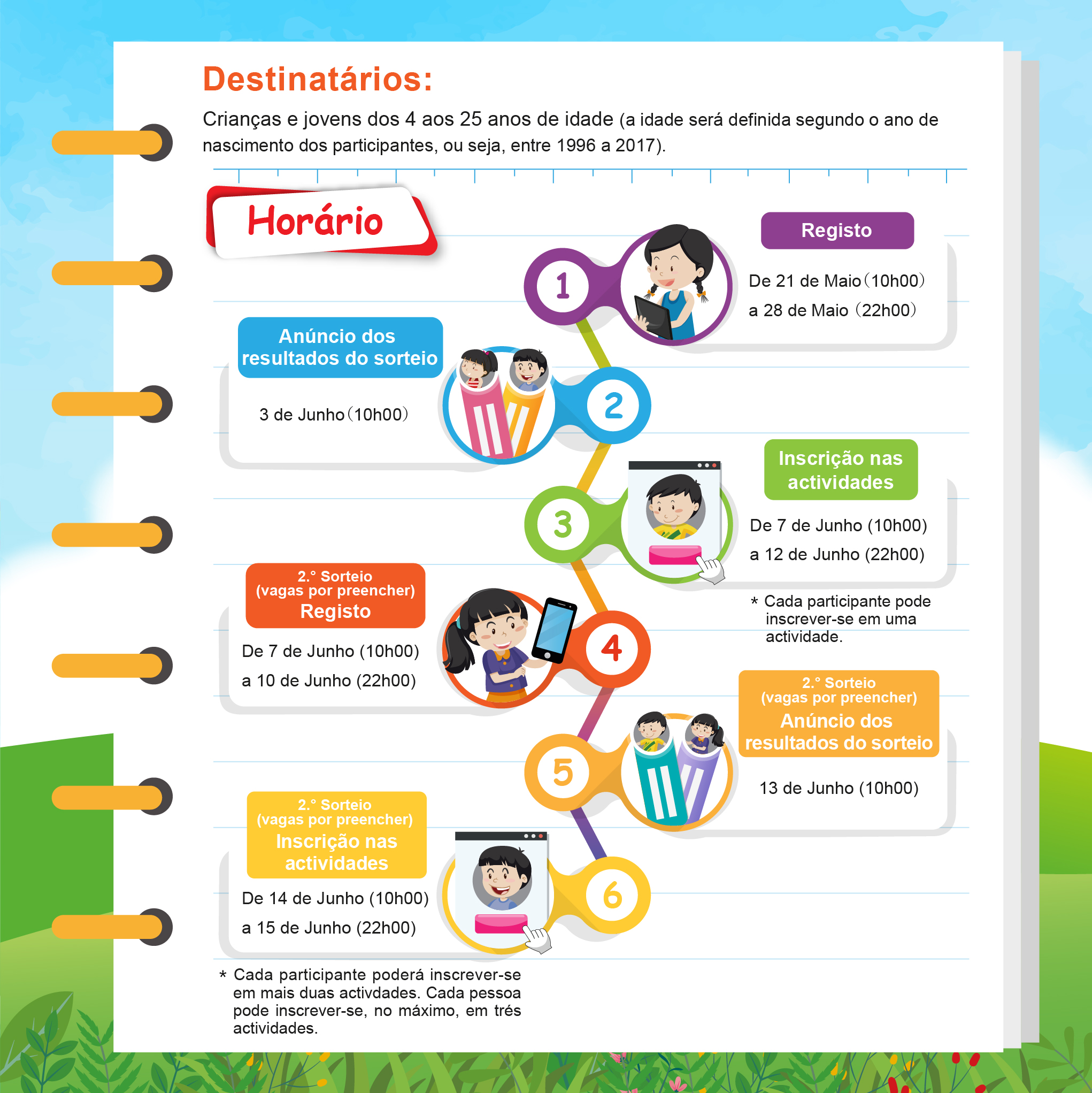 O processo de inscrição (registo, sorteio e inscrição) das Actividades de Férias realiza-se através da Internet. A partir das 10 horas de 21 de Maio, será iniciada o primeiro passo - registo, as crianças e jovens que reúnem as condições podem fazer o registo até às 22 horas do dia 28 de Maio. Cada participante poderá inscrever-se numa turma, no período de inscrição das vagas restantes, poderão inscrever-se mais duas turmas, 3 turmas por pessoa no máximo.