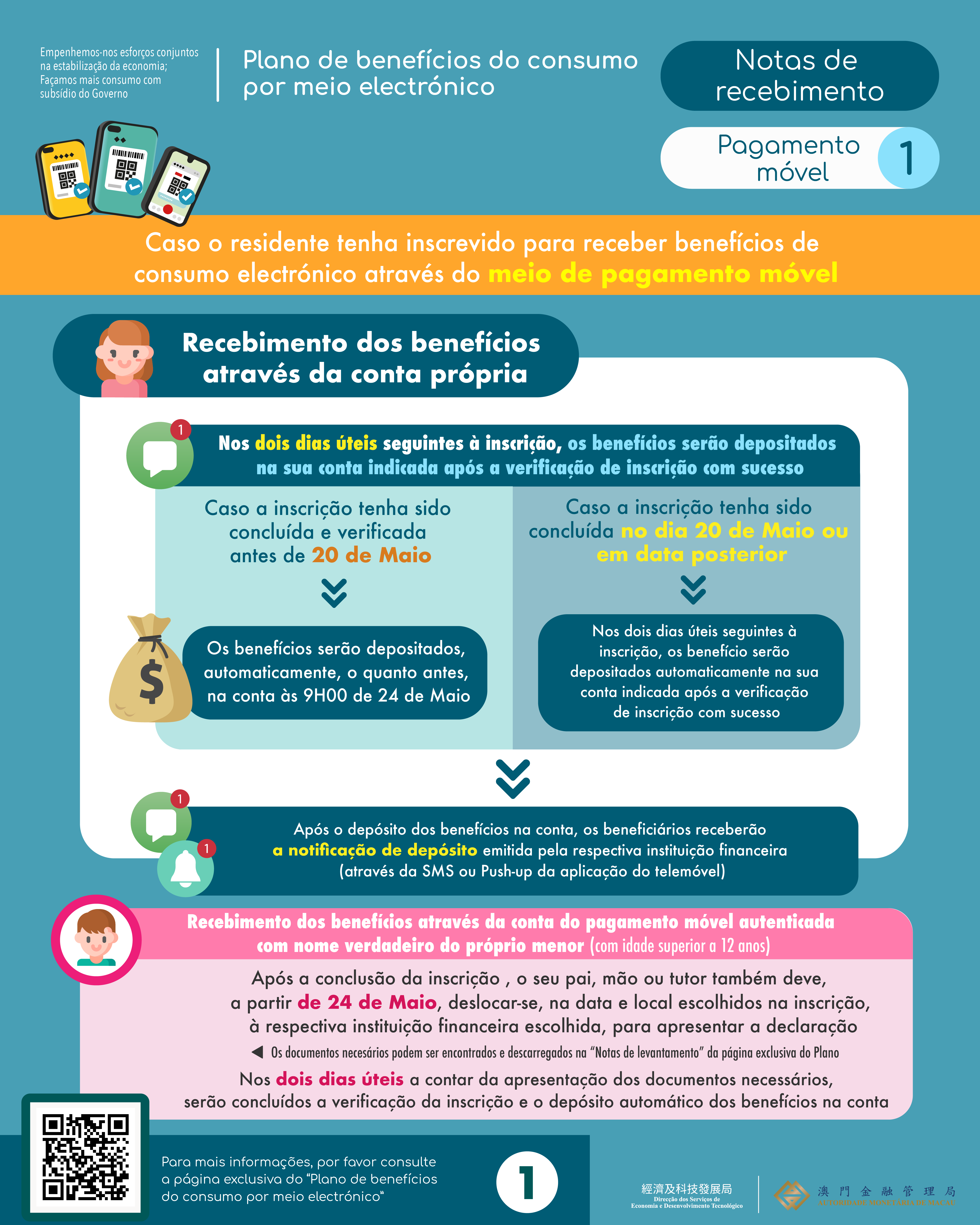Para os residentes que optem por receber os benefícios de consumo através do “pagamento móvel” e tenham a sua inscrição concluída e verificada antes de 20 de Maio, eles poderão receber, a partir das 9H00 da amanhã (dia 24), a notificação de depósito emitida pela respectiva instituição financeira através da SMS ou Push-up da aplicação do telemóvel, dando conta de que o pacote dos benefícios já tiver sido depositado na conta autenticada com nome verdadeiro indicada.