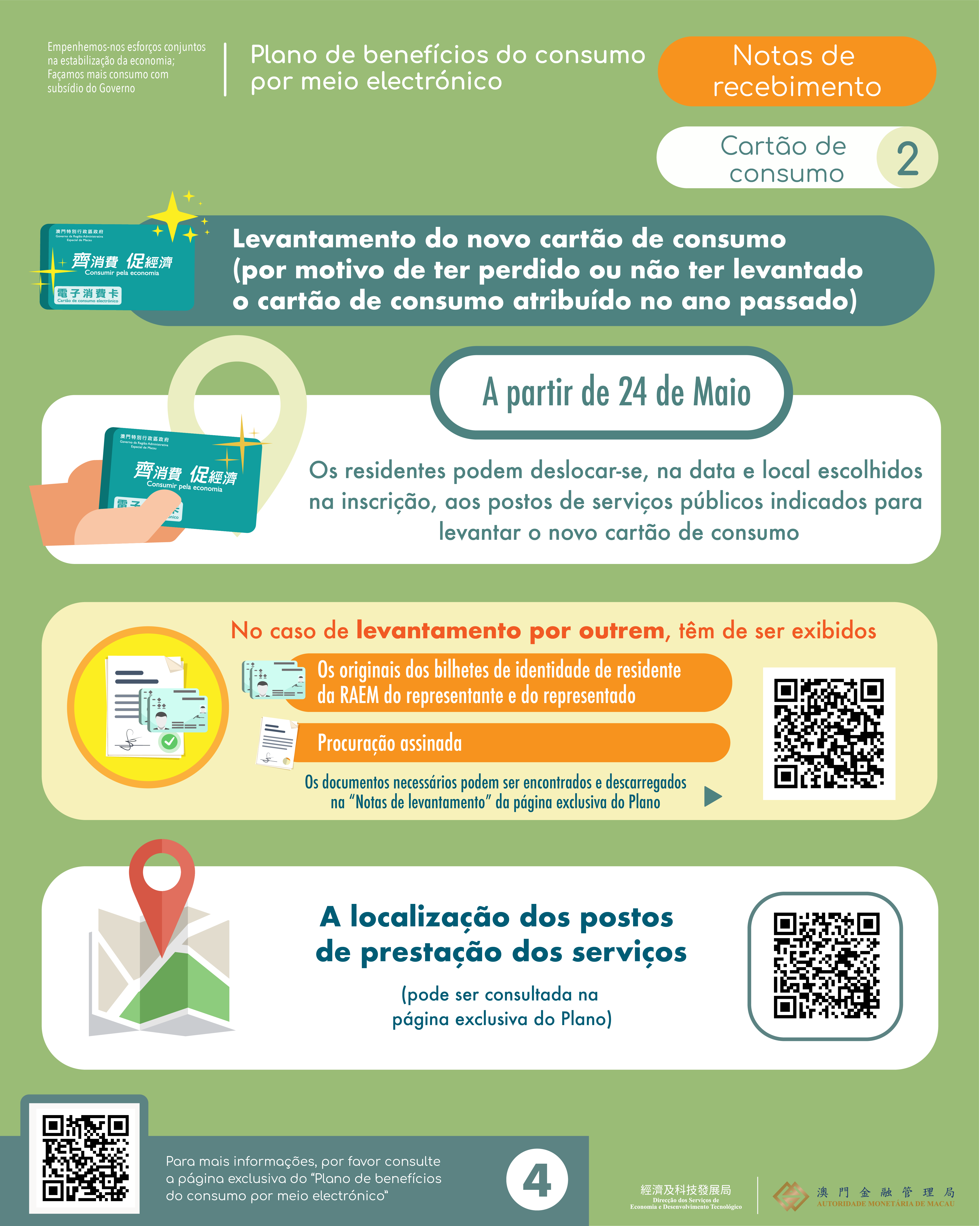 Em caso de levantamento do novo cartão de consumo (por motivo de ter perdido ou não ter levantado o cartão de consumo atribuído no ano passado), a partir da amanhã (dia 24), os residentes também devem deslocar-se, na data e local escolhidos na inscrição, ao posto de serviços públicos indicado para levantar o novo cartão de consumo. A localização dos postos de levantamento de cartão de consumo pode ser consultada na página exclusiva do Plano (https://www.dsedt.gov.mo/econsumo/pt_PT/pickup_card_loc.jsp).