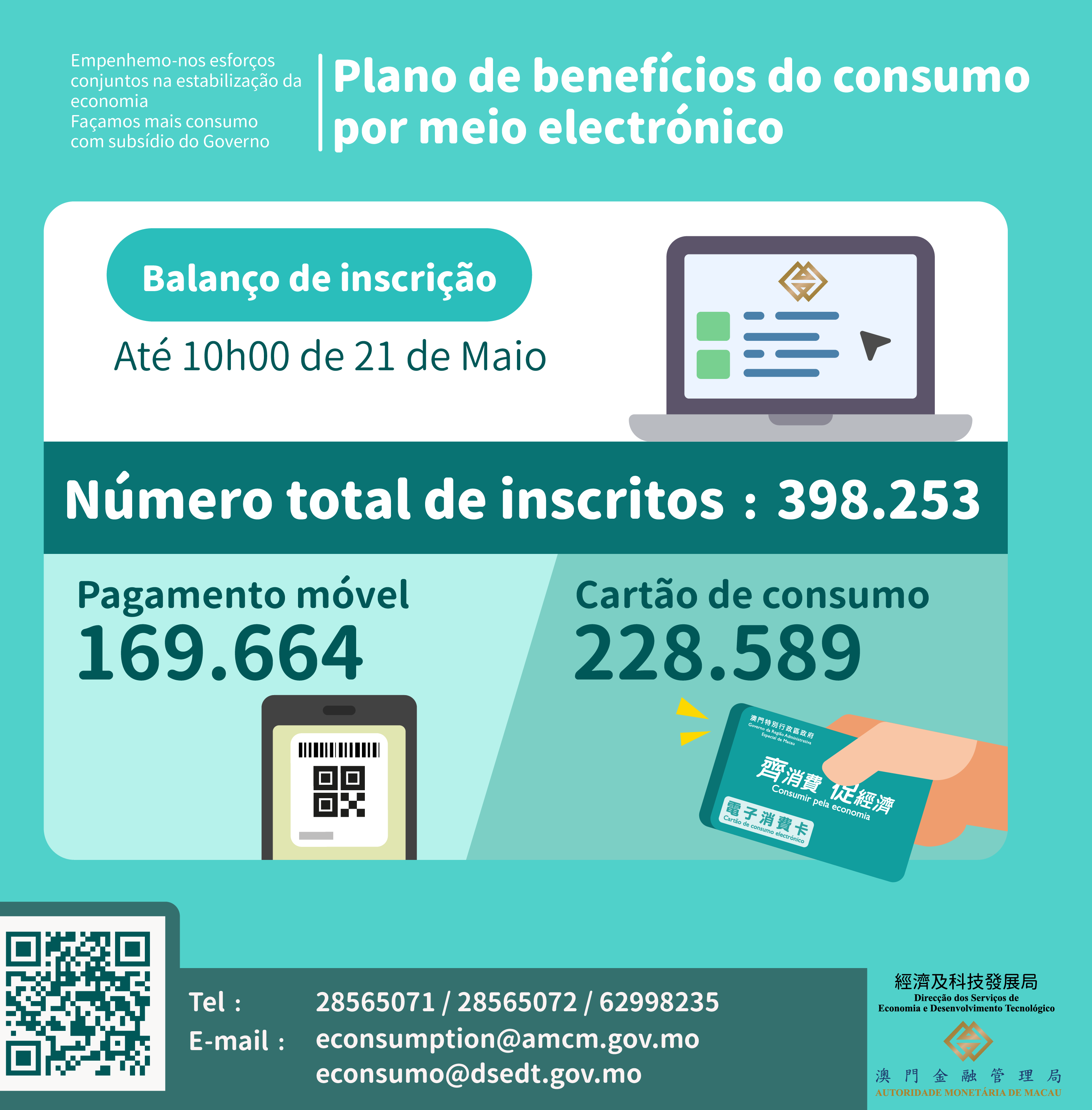 Caso os residentes tenham concluído a inscrição do“Plano de benefícios de consumo por meio electrónico”e a respectiva verificação tenha sido aprovada antes de 20 de Maio, poderão receber, a partir das 9H00 da amanhã (dia 24), o pacote dos benefícios de consumo (montante inicial de 5.000 patacas e montante para desconto imediato de 3.000 patacas) através do depósito automático na conta do pagamento móvel ou do carregamento do cartão de consumo, o qual poderá ser utilizado a partir de 1 de Junho.