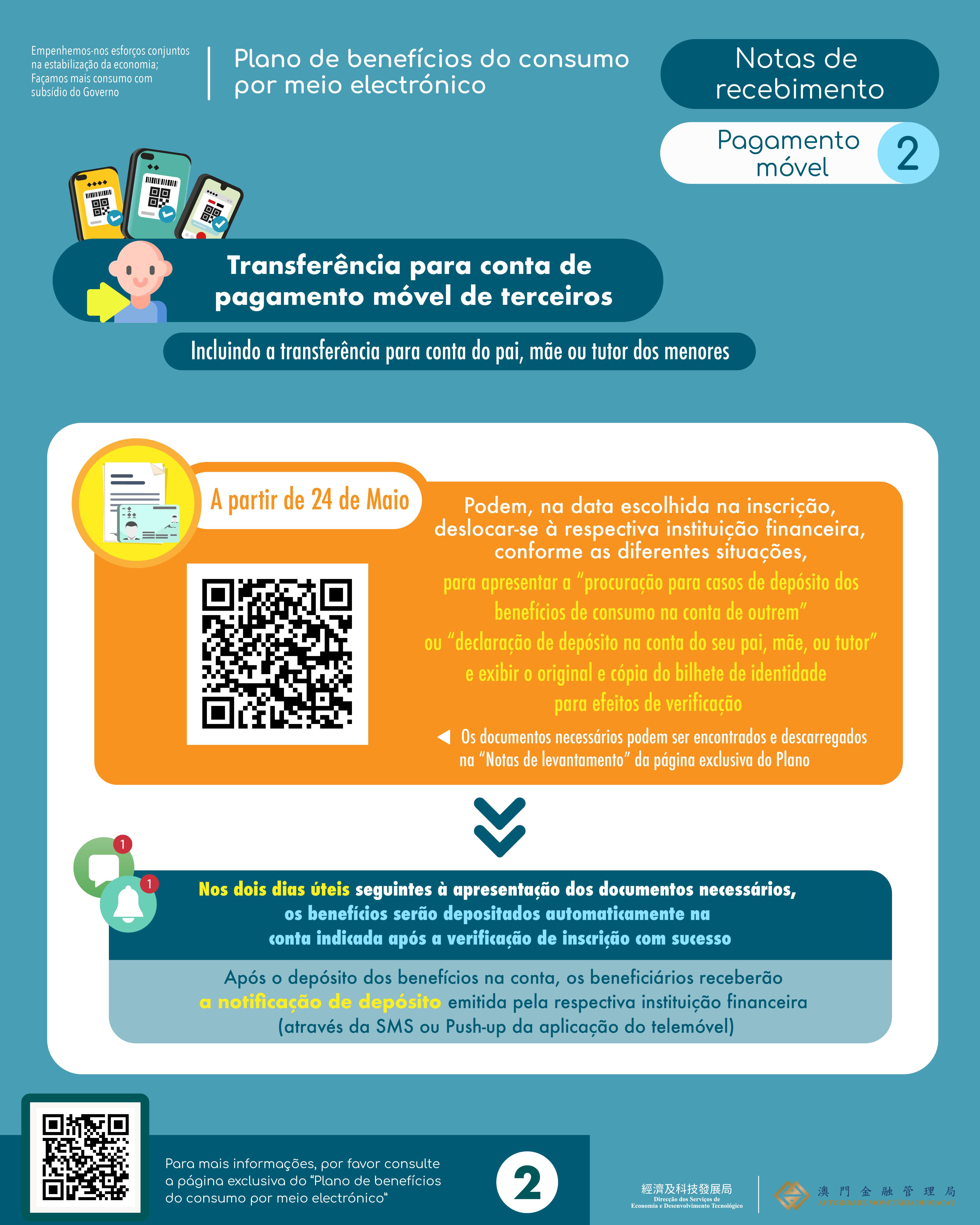 Em caso de transferência dos benefícios, incluindo a transferência dos benefícios dos filhos menores para a conta do pagamento móvel dos seus pais, mães ou tutores, a partir da amanhã (dia 24), devem estes deslocar-se, na data e local escolhidos na inscrição, à respectiva instituição financeira para apresentar a procuração e exibir o bilhete de identidade para efeitos de verificação.