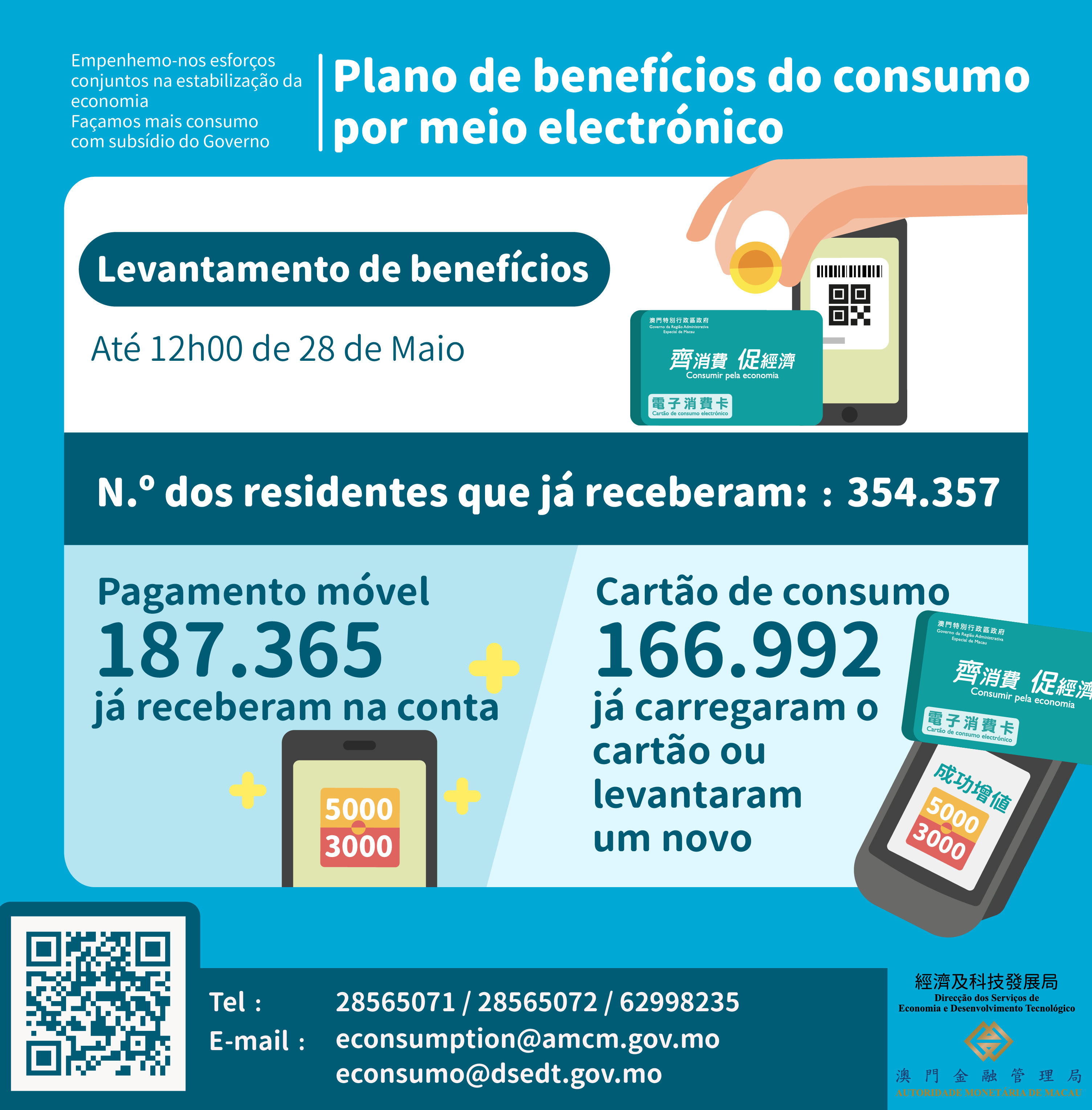 Até ao meio-dia de hoje (dia 28), mais de 354 000 residentes já receberam os “benefícios de consumo por meio electrónico”. De entre esses residentes, cerca de 167 000 já concluíram o carregamento do cartão de consumo ou já levantaram o novo cartão. Além disso, cerca de 187 000 residentes receberam sucessivamente os benefícios através do depósito automático na conta do “pagamento móvel”.