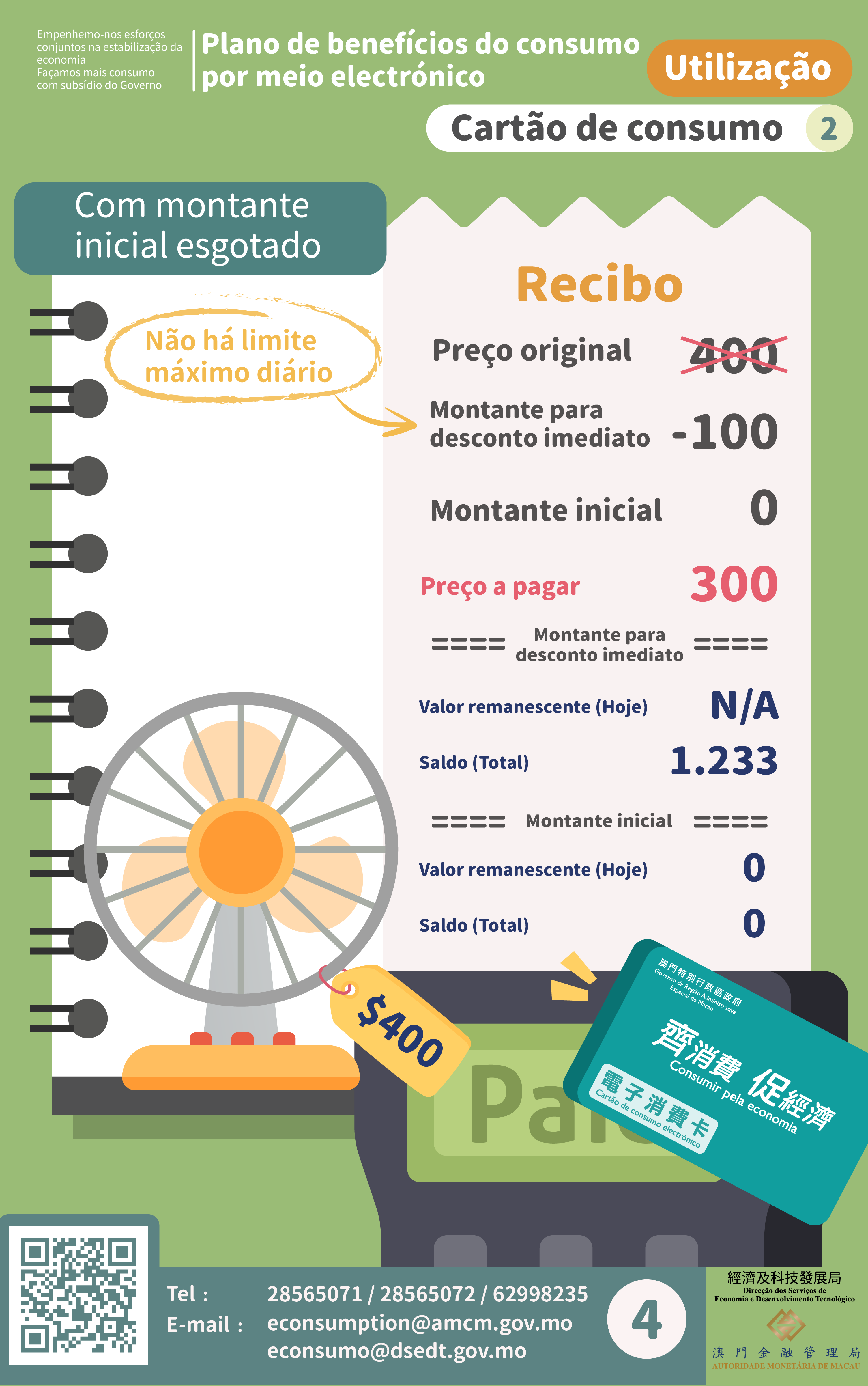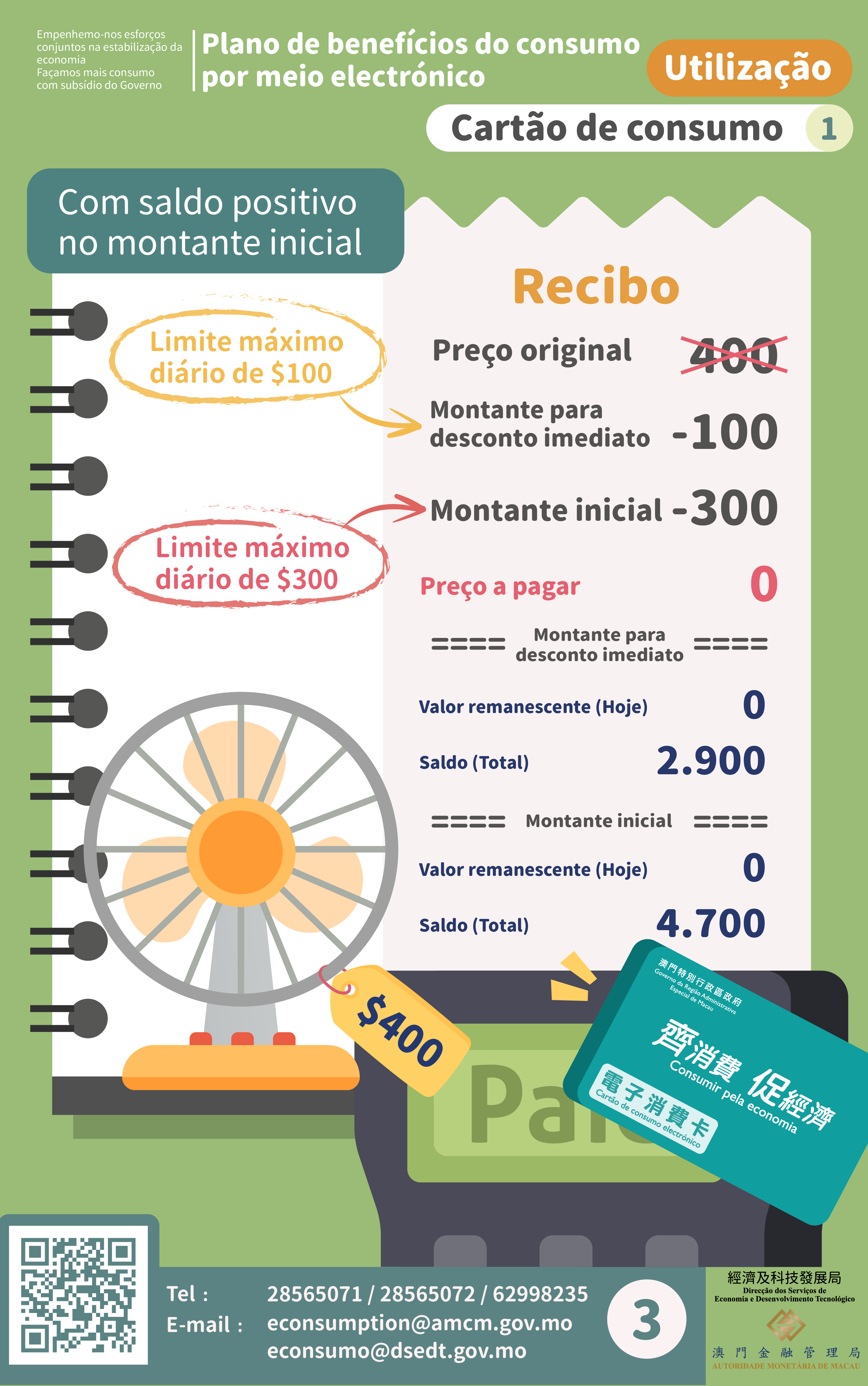 Quando houver saldos no montante inicial, o limite máximo diário de utilização do montante inicial é de 300 patacas, e o “desconto imediato” vai ser deduzido automaticamente em proporção, equivalendo às 100 patacas do limite máximo diário de utilização do desconto imediato. Por outras palavras, os residentes podem, por cada dia, adquirir gratuitamente bens ou serviços no valor de 400 patacas através do pacote de benefícios.
