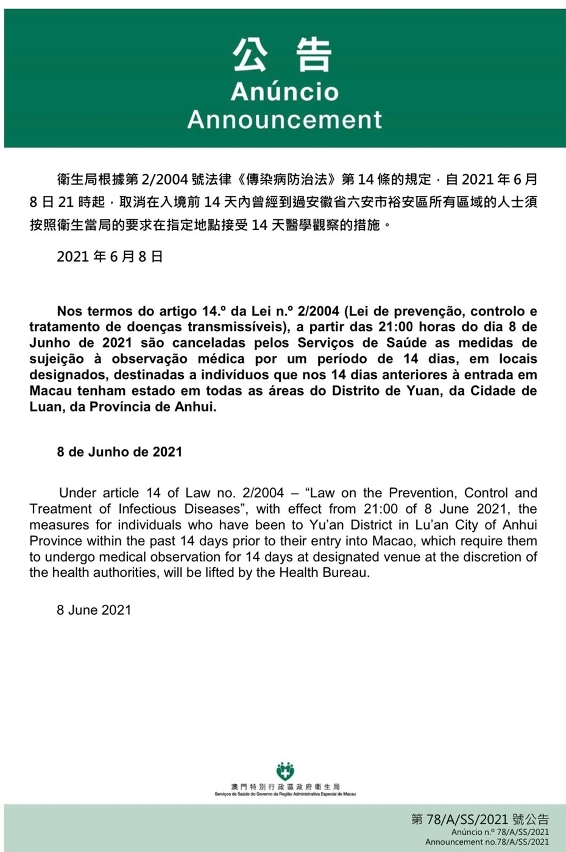 Por outro lado, tendo em conta a evolução epidemiológica mais actualizada da Província de Anhui, nos termos do artigo 14.º da Lei n.º 2/2004 (Lei de prevenção, controlo e tratamento de doenças transmissíveis), a partir das 21:00 horas do dia 8 de Junho de 2021, são canceladas pelos Serviços de Saúde as medidas de sujeição à observação médica por um período de 14 dias, em locais designados, destinadas a indivíduos que nos 14 dias anteriores à entrada em Macau tenham estado em todas as áreas do Distrito de Yuan, da Cidade de Luan, da Província de Anhui.