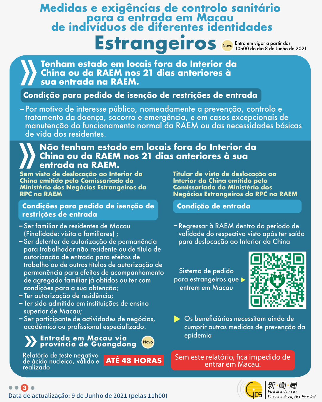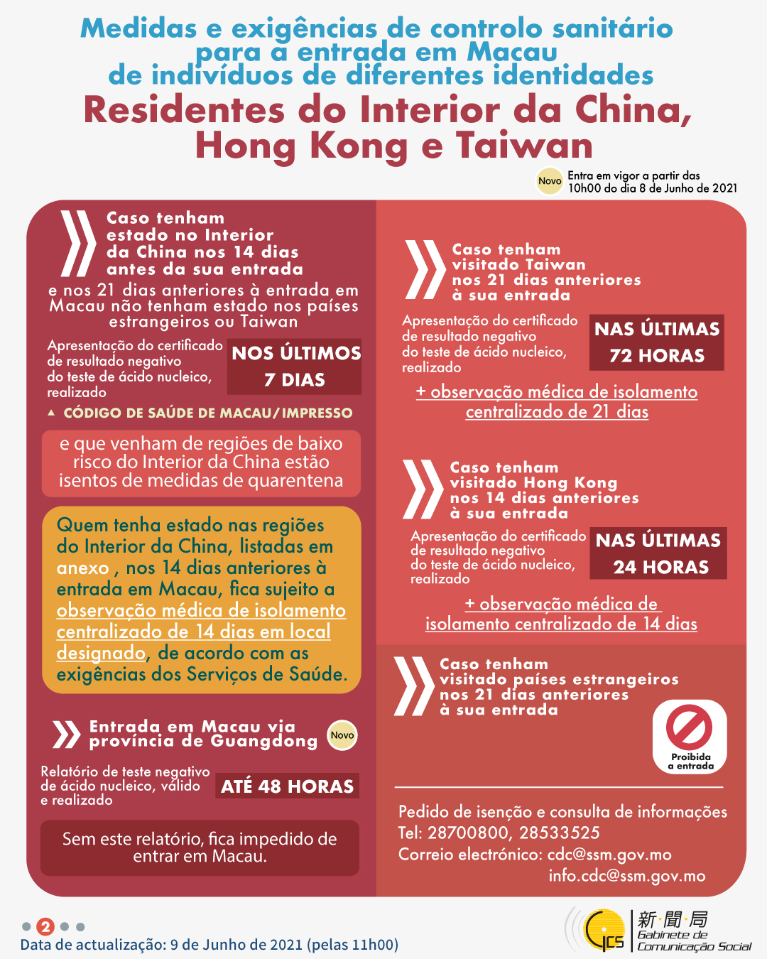 (Infografia)Medidas e exigências de controlo sanitário para a entrada em Macau de indivíduos de diferentes identidades, actualizadas no dia 9 de Junho de 2021
