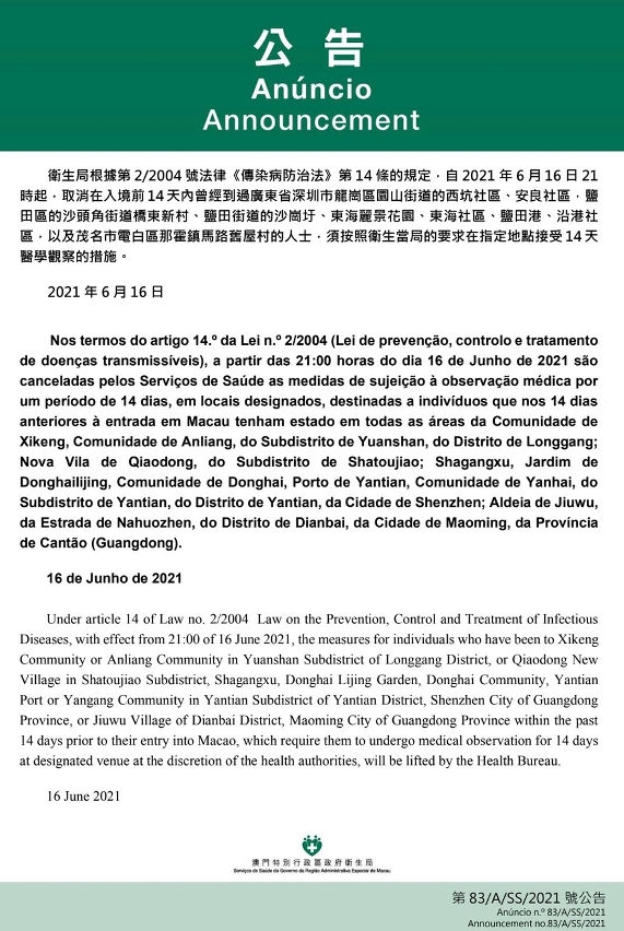 O Centro de Coordenação de Contingência do Novo Tipo de Coronavírus informa que tendo em consideração a evolução epidemiológica mais actualizada da Província de Cantão (Guangdong), nos termos do artigo 14.º da Lei n.º 2/2004 (Lei de prevenção, controlo e tratamento de doenças transmissíveis), a partir das 21:00 horas do dia 16 de Junho de 2021, são canceladas as medidas de observação médica por um período de 14 dias destinadas aos indivíduos que nos 14 dias anteriores à entrada em Macau tenham estado na Comunidade de Xikeng, Comunidade de Anliang, do Subdistrito de Yuanshan, do Distrito de Longgang; Nova Vila de Qiaodong, do Subdistrito de Shatoujiao; Shagangxu, Jardim de Donghailijing, Comunidade de Donghai, Porto de Yantian, Comunidade de Yanhai, do Subdistrito de Yantian, do Distrito de Yantian, da Cidade de Shenzhen; Habitação de Jiuwu, da Estrada de Nahuozhan, do Distrito de Dianbai, da Cidade de Maoming, da Província de Cantão (Guangdong).