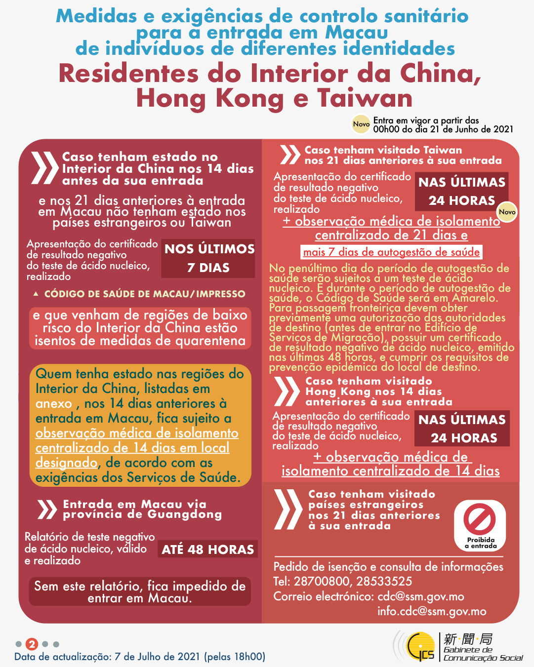(Infografia)Medidas e exigências de controlo sanitário para a entrada em Macau de indivíduos de diferentes identidades, actualizadas no dia 7 de Julho de 2021