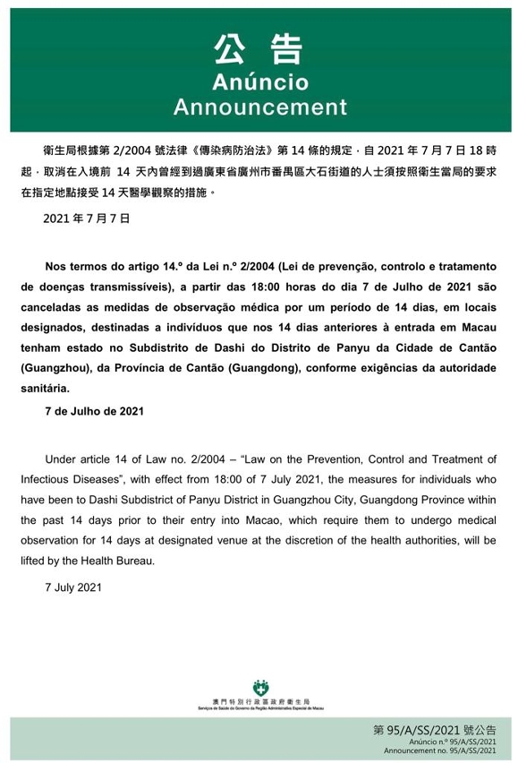 O Centro de Coordenação de Contingência do Novo Tipo de Coronavírus informa que tendo em consideração a evolução epidemiológica actualizada da Província de Cantão (Guangdong), nos termos do artigo 14.º da Lei n.º 2/2004 (Lei de prevenção, controlo e tratamento de doenças transmissíveis), a partir das 18:00 horas do dia 7 de Julho de 2021 são canceladas as medidas de observação médica por um período de 14 dias, em locais designados, destinadas a indivíduos que nos 14 dias anteriores à entrada em Macau tenham estado no Subdistrito de Dashi do Distrito de Panyu da Cidade de Cantão (Guangzhou), da Província de Guangdong, conforme exigências da autoridade sanitária.