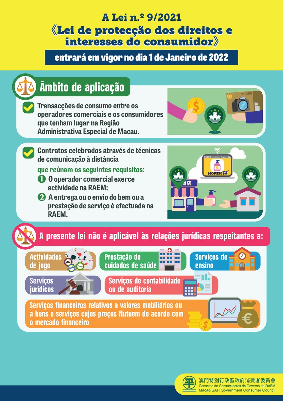 A «Lei de protecção dos direitos e interesses do consumidor» aplica-se às relações jurídicas, relativas ao fornecimento de bens ou à prestação de serviços, estabelecidas entre os operadores comerciais e os consumidores que tenham lugar na Região Administrativa Especial de Macau, sendo excluídos da mesma lei os seguintes: jogos de fortuna ou azar, jogos interactivos, apostas mútuas ou operações oferecidas ao público; prestação de cuidados de saúde; serviços de ensino; serviços jurídicos, serviços de contabilidade ou de auditoria; serviços financeiros relativos a valores mobiliários ou a bens e serviços cujos preços flutuem de acordo com o mercado financeiro.