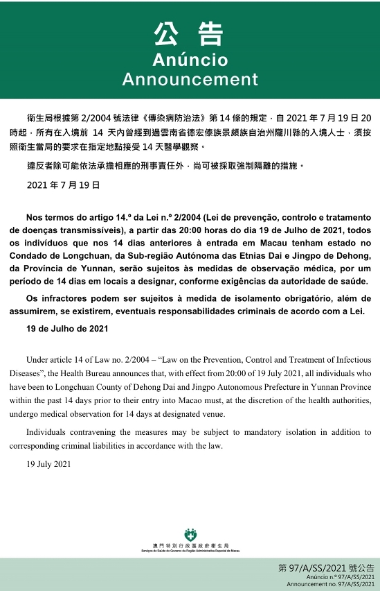 O Centro de Coordenação de Contingência do Novo Tipo de Coronavírus informa que tendo em consideração a evolução epidemiológica mais actualizada da Província de Yunnan, nos termos do artigo 14.º da Lei n.º 2/2004 (Lei de prevenção, controlo e tratamento de doenças transmissíveis), a partir das 20:00 horas do dia 19 de Julho de 2021, todos os indivíduos que nos 14 dias anteriores à entrada em Macau tenham estado no Condado de Longchuan, da Sub-região Autónoma das Etnias Dai e Jingpo de Dehong, da Província de Yunnan, serão sujeitos às medidas de observação médica, por um período de 14 dias em locais a designar, conforme exigências da autoridade de saúde.