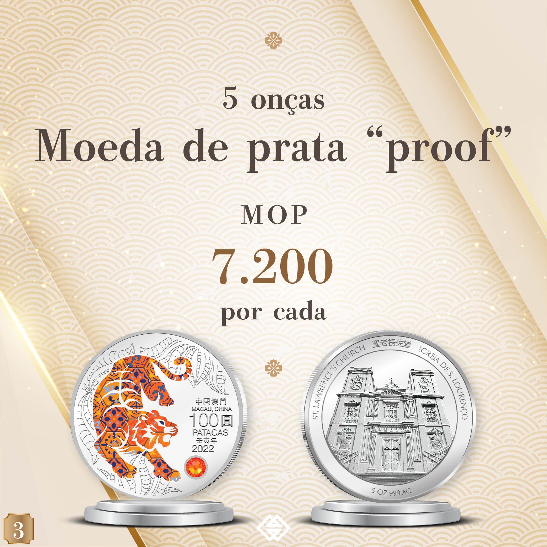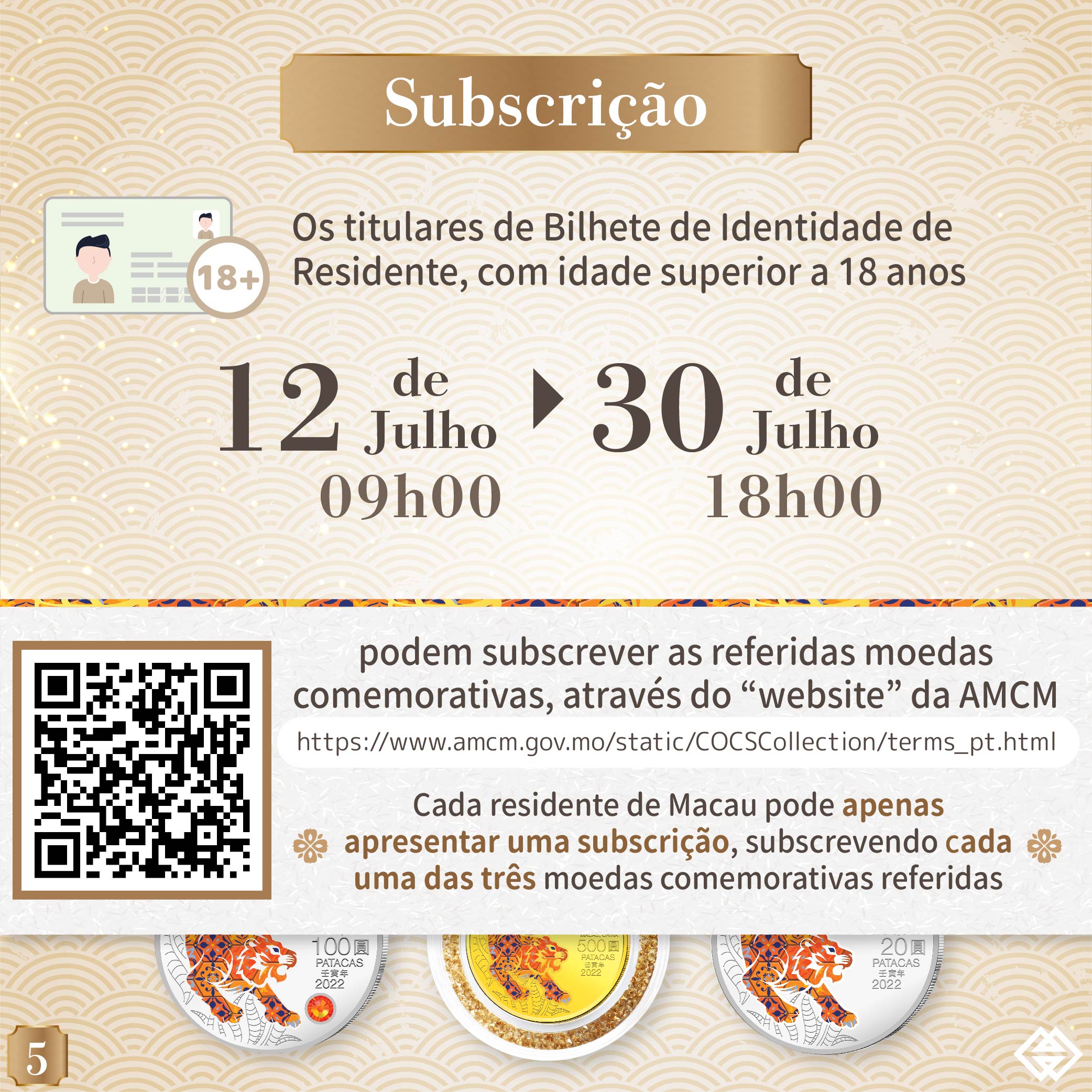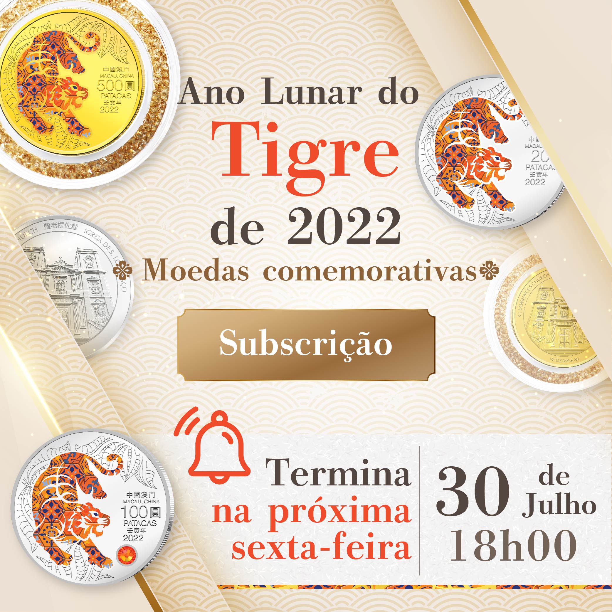 O prazo para a subscrição online das moedas comemorativas do Ano Lunar do Tigre termina às 18 horas da próxima sexta-feira (dia 30 de Julho). Assim, a AMCM gostaria de alertar os residentes interessados em subscrever estas moedas para a necessidade de concluírem o processo de subscrição online antes do termo do referido prazo. A AMCM instalou um balcão no seu átrio para servir os cidadãos idosos que necessitem de assistência. Para qualquer esclarecimento, por favor queiram contactar-nos, através da linha exclusiva da AMCM: 28565071 ou do website da AMCM: ( https://www.amcm.gov.mo/static/COCSCollection/terms_pt.html ).