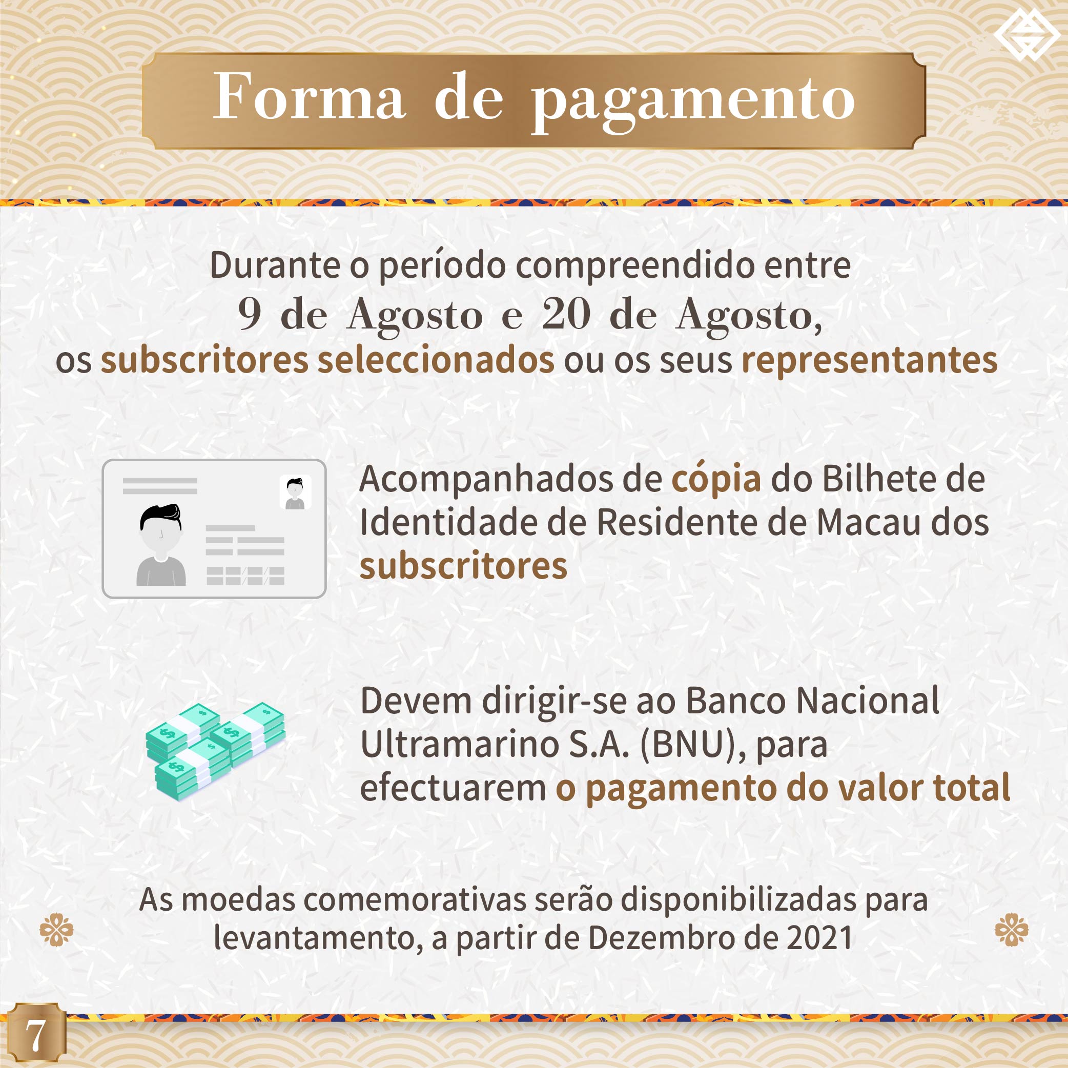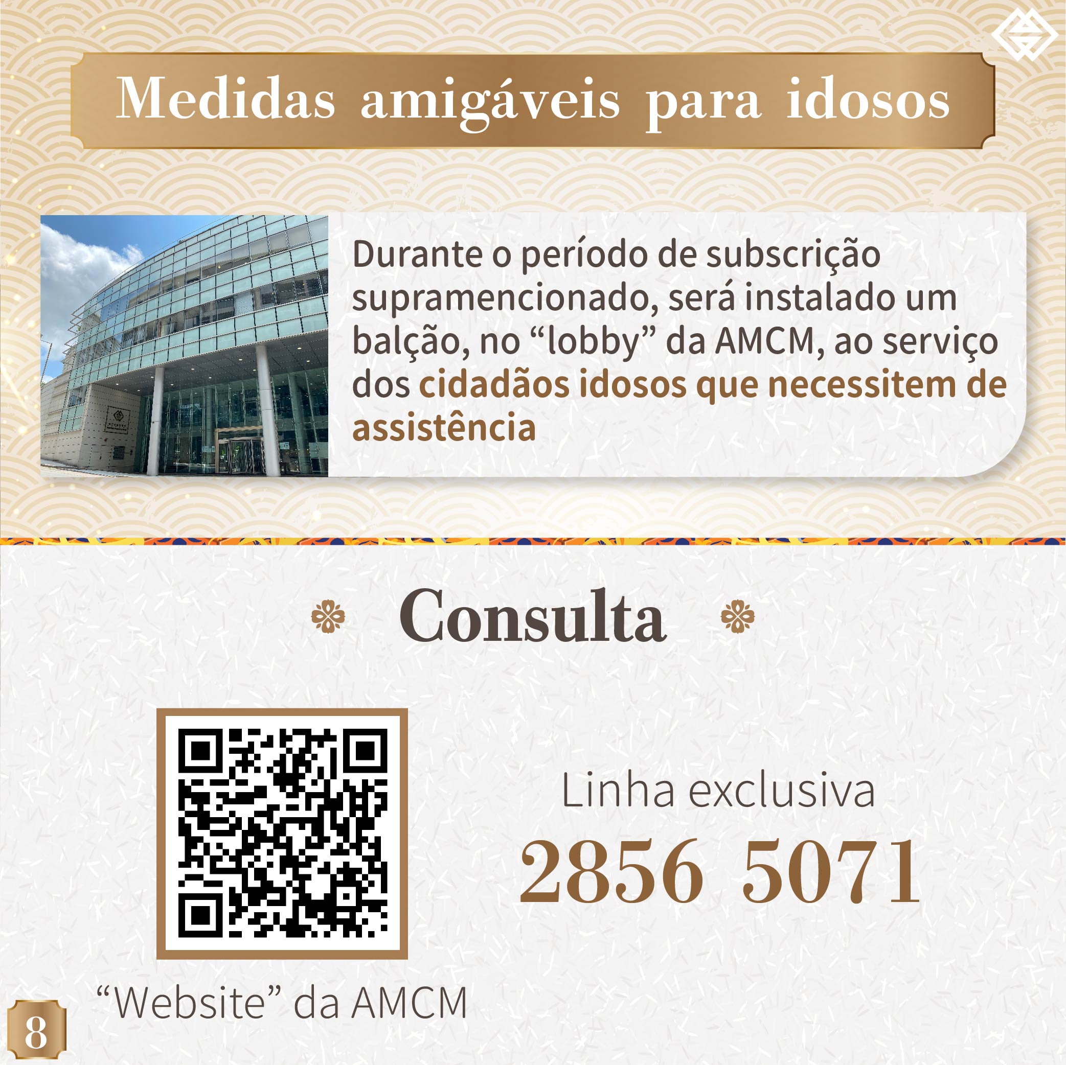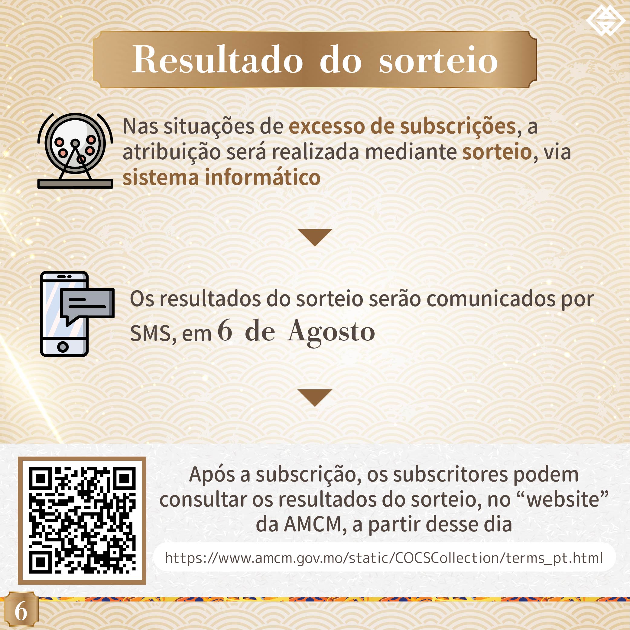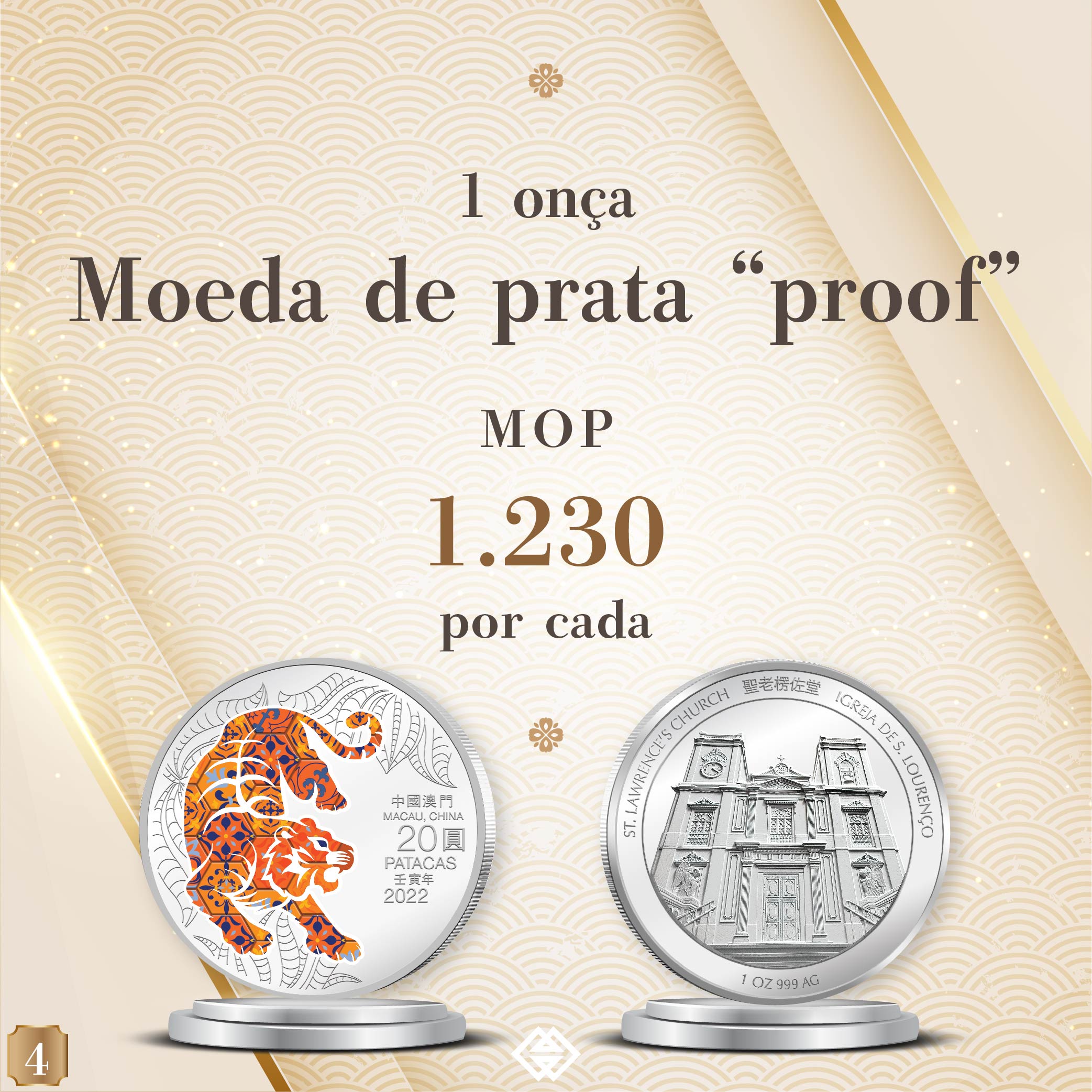 O prazo para a subscrição online das moedas comemorativas do Ano Lunar do Tigre termina às 18 horas da próxima sexta-feira (dia 30 de Julho). Assim, a AMCM gostaria de alertar os residentes interessados em subscrever estas moedas para a necessidade de concluírem o processo de subscrição online antes do termo do referido prazo. A AMCM instalou um balcão no seu átrio para servir os cidadãos idosos que necessitem de assistência. Para qualquer esclarecimento, por favor queiram contactar-nos, através da linha exclusiva da AMCM: 28565071 ou do website da AMCM: ( https://www.amcm.gov.mo/static/COCSCollection/terms_pt.html ).