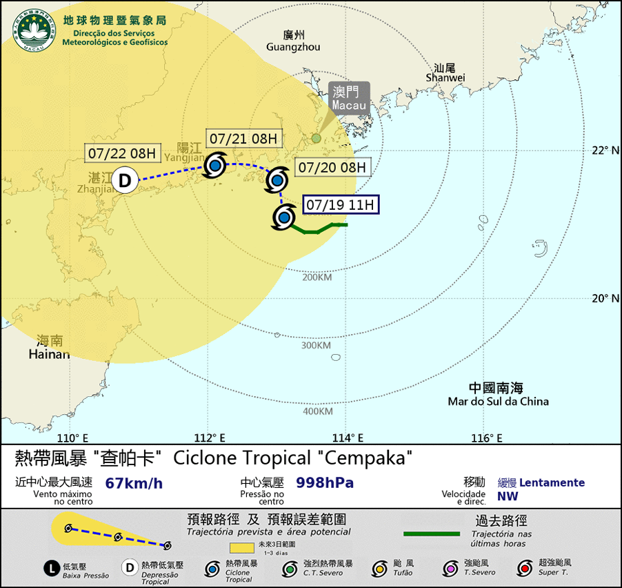 A dimensão do ciclone tropical “Cempaka” é relativamente pequena. Nas próximas 24 horas, espera-se que “Cempaka” se mova para o quadrante norte. Entre a madrugada e o início da manhã no dia 20, vai atingir o ponto mais próximo da região, a cerca de 100 km a sudoeste de Macau. Sob a influência da circurlação relacionada, entre a hoje à noite e o início da manhã de amanhã, o vento pode atingir o nível 6 da escala “Beaufort” e na região podem ocorrer aguaceiros fortes. Se amanhã, "Cempaka" se intensificar e/ou se aproximar do território, a possibilidade de emissão do sinal de n.o 8 não pode ser descartada. Preste atenção às condições meteorológicas.