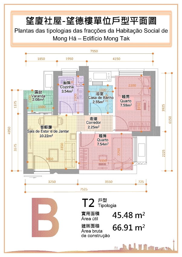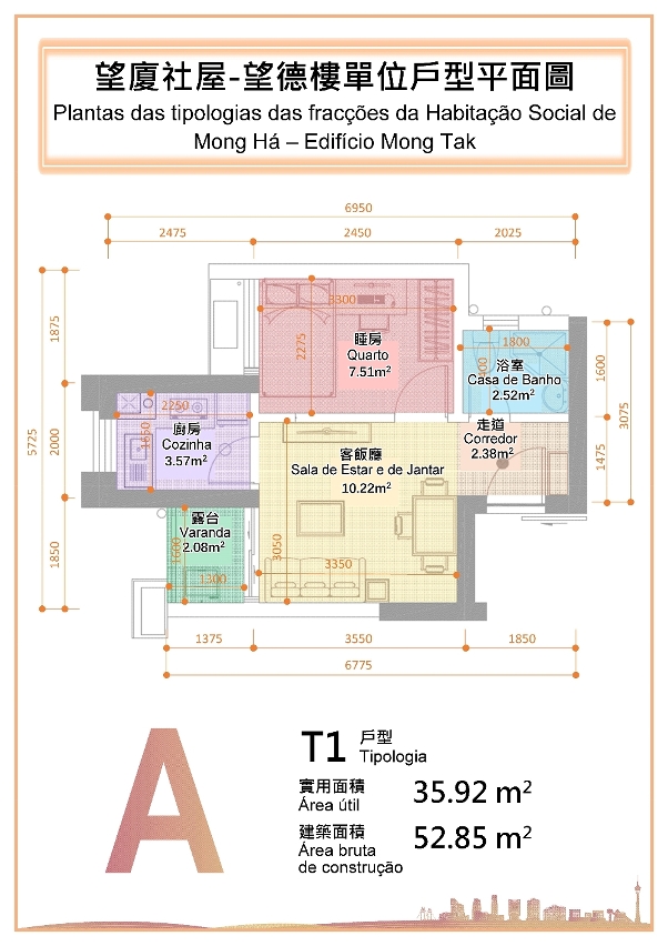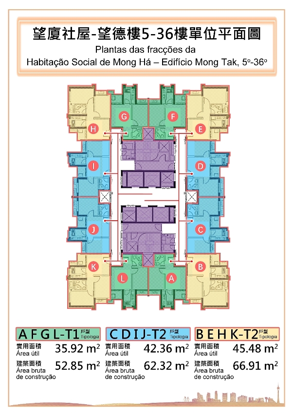 O Edifício Mong Tak, sita na Rua de Francisco Xavier Pereira de Macau é composto por 37 andares e 3 pisos em cave, comportando um total de 768 fracções de T1 e T2, distribuídas pelas 256 fracções de tipologia T1 e 512 fracções de tipologia T2. A área das fracções de T1 é de 35,92 m2 e das fracções de T2 é de 42,36 a 45,48 m2.