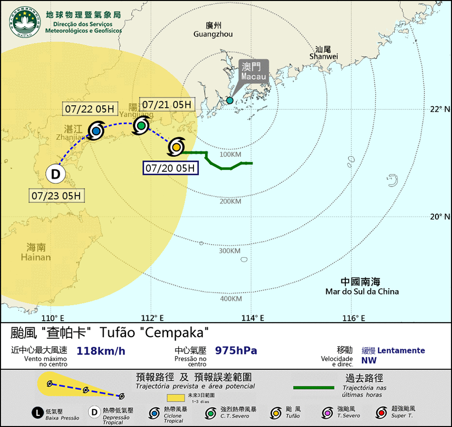 Devido à influência de chuva forte e “Strom Surge” trazidas por “Cempaka”, espera-se que possa ocorrer uma inundação de cerca de 0,5 m em zonas baixas do Porto Interior. Por outro lado, o aviso de “Storm Surge” azul continua em vigor. Os residentes que tenham actividades em zonas baixas devem prestar atenção às informações relevantes.