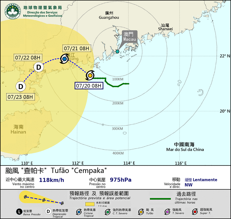Embora o tufão "Cempaka" se tenha intensificado significativamente na noite do dia 19, a sua dimensão manteve-se pequena. "Cempaka" adoptou uma trajetória mais a oeste do que o antecipado, e manteve-se a uma distância superior a 140 quilómetros de Macau, por isso mais distante do território do que o esperado. Assim a possibilidade de emitir sinal superior durante a manhã é baixa, e o sinal n.º 3 vai ficar em vigor esta manhã. Espera-se que "Cempaka" se aproxime gradualmente da costa de Yangjiang durante o dia. A menos que "Cempaka" adopte novamente uma trajetória mais próxima de Macau, há pouca probabilidade de emitir sinal mais alto. Como a intensidade e os movimentos de "Cempaka" ainda são incertos. Esta Direcção aconselha a população a seguir as informações de tempestade tropical mais recentes.