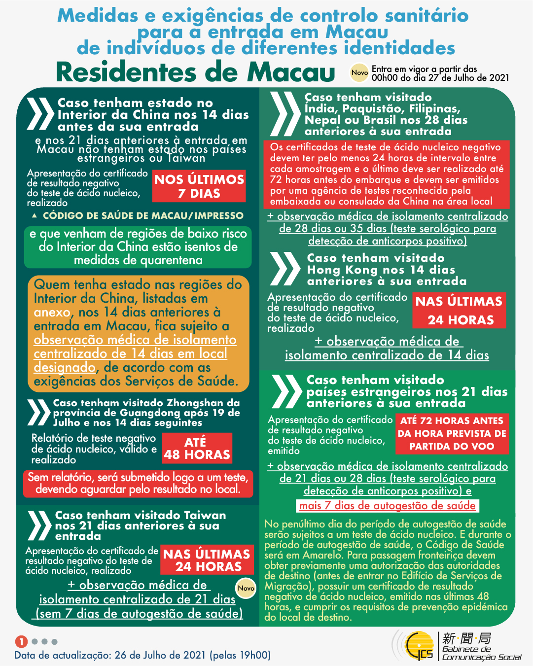 (Infografia)Medidas e exigências de controlo sanitário para a entrada em Macau de indivíduos de diferentes identidades, actualizadas no dia 26 de Julho de 2021