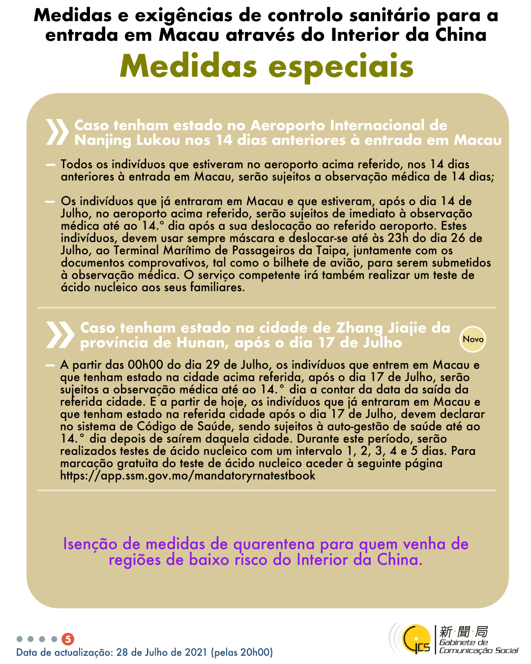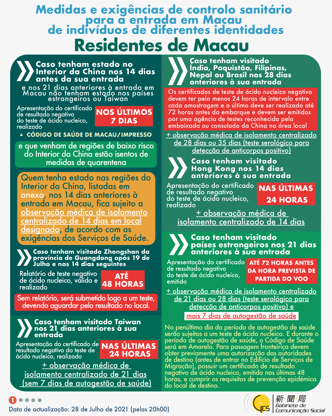(Infografia)Medidas e exigências de controlo sanitário para a entrada em Macau de indivíduos de diferentes identidades, actualizadas no dia 28 de Julho de 2021