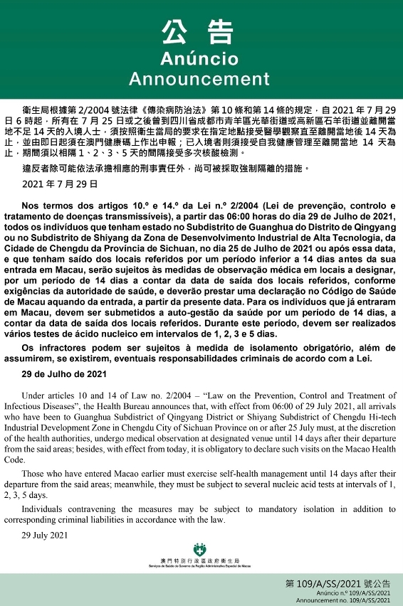 O Centro de Coordenação de Contingência do Novo Tipo de Coronavírus (doravante designado por Centro) anunciou que, tendo em consideração o risco de propagação da COVID-19 na Cidade de Chengdu da Província de Sichuan, nos termos dos artigos 10.º e 14.º da Lei n.º 2/2004 (Lei de prevenção, controlo e tratamento de doenças transmissíveis), a partir das 06:00 horas do dia 29 de Julho de 2021, todos os indivíduos que tenham estado no Subdistrito de Guanghua do Distrito de Qingyang ou no Subdistrito de Shiyang da Zona de Desenvolvimento Industrial de Alta Tecnologia, da Cidade de Chengdu da Província de Sichuan, no dia 25 de Julho de 2021 ou após essa data, e que tenham saído dos locais referidos por um período inferior a 14 dias antes da sua entrada em Macau, serão sujeitos às medidas de observação médica em locais a designar, por um período de 14 dias a contar da data de saída dos locais referidos, conforme exigências da autoridade de saúde, e deverão prestar uma declaração no Código de Saúde de Macau aquando da entrada, a partir de agora.